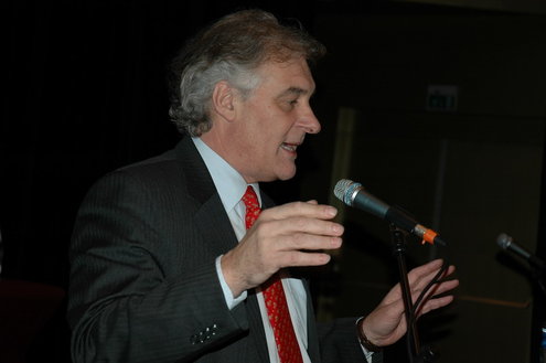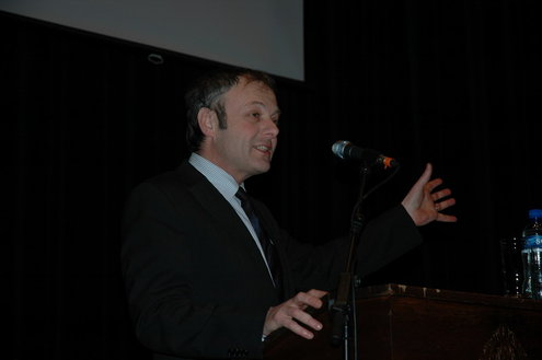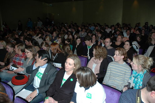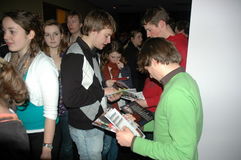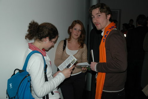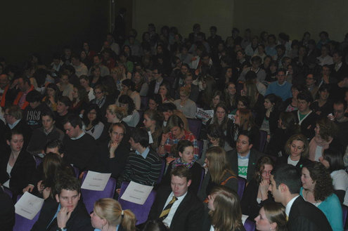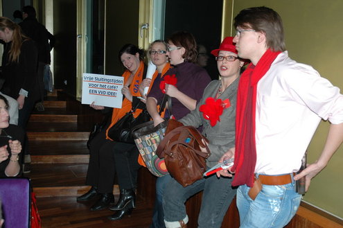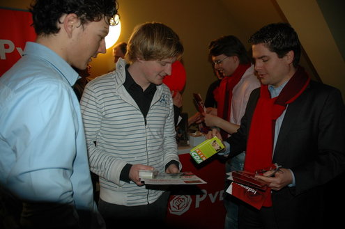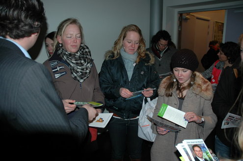 De studenten werden bij binnenkomst in de Stadsgehoorzaal overladen met folders, posters, sp-sponsjes, kaartspelen, vvd-condooms, pennen en alles wat de partijen nog meer hadden verzonnen in hun strijd om de gunst van de kiezers. (Foto's: Chris de Waard).