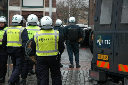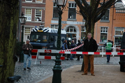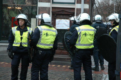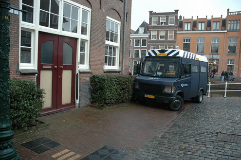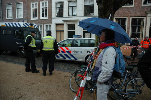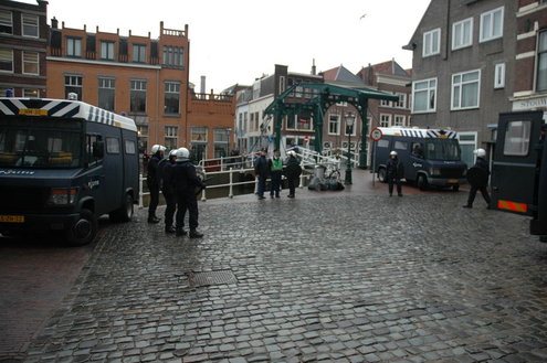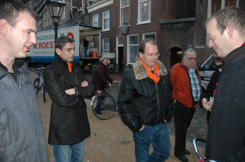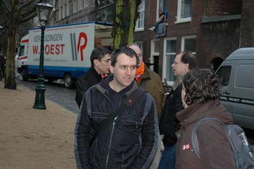 Voorzitter Jaap van Meijgaarden van de wijkvereniging Pancras-West die al jaren met de vrijplaats overhoop ligt, kijkt ook toe bij de ontruiming. “Het is jammer voor de weggeefwinkel, daar zijn wij nooit tegen geweest.” Ondertussen heeft ook een handjevol VVD-ers onder leiding van wethouder van Woensel zich verzameld achter de linten waarmee de politie de Hooglandse Kerkgracht heeft afgezet. Compleet met oranje campagnesjaal. “maar we vieren hier geen feestje,” zegt raadslid Zevenbergen. “We zijn altijd helder geweest in ons standpunt dat de Koppenhinksteeg moest worden ontruimd toen legalisatie niet haalbaar bleek.” Even verderop staan ook raadsleden van de SP, GroenLinks en D66. Drie partijen die in principe tegen een gedwongen ontruiming waren.
