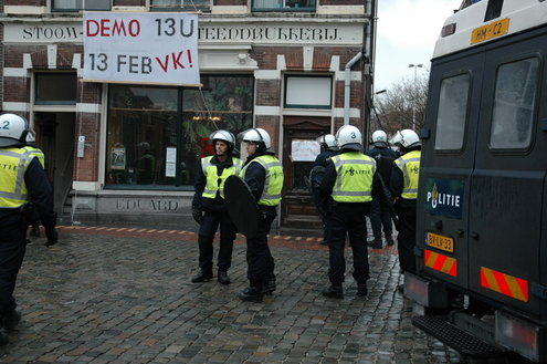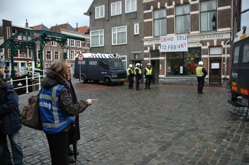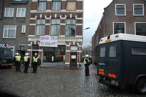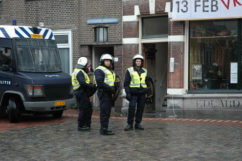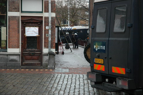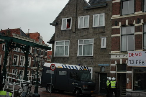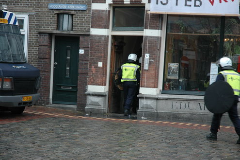 Burgemeester Lenferink gaf vanmorgen leiding aan de ontruiming, waarbij in de loop van de ochtend zes krakers werden aangehouden. Ook gistermiddag werd al een aanhouding verricht toen één van de vrijwilligers van de vrijplaats zich volgens de politie verdacht ophield en zich vervolgens niet wilde legitimeren. (Foto's: Chris de Waard).