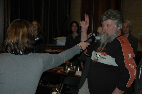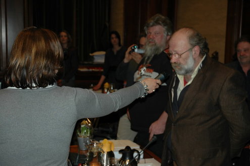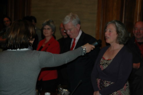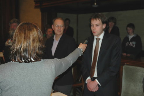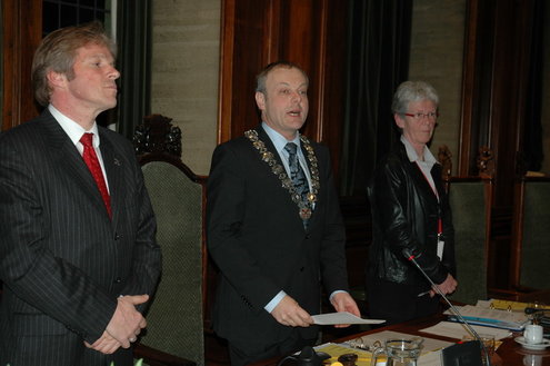 Wethouder Marc Witteman (links) was naast raadsgriffier Noor van der Vlist en burgemeester Lenferink de enige die afgelopen avond achter de collegetafel plaatsnam. Hij is de enige wethouder die niet tot raadslid is benoemd. (Foto's: Chris de Waard).