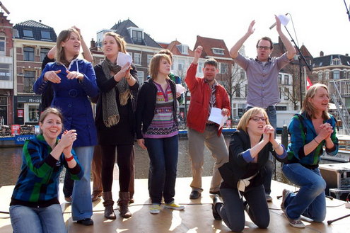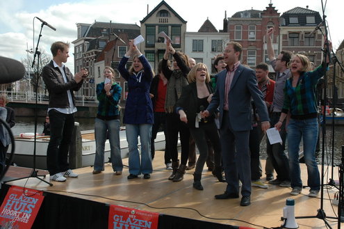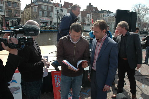 Nadat studentenkoor Collegium Musicum nog een keer, onder leiding van een luidkeels meezingende wethouder De Haan, het lied “Beggin’ 3FM, zet het Glazen Huis in Leiden” had gezongen, werden tot slot 9000 handtekeningen overhandigd van Leidenaren die allemaal graag willen dat het Glazen Huis naar de Sleutelstad komt. “En dat zijn nog maar de eerste 9000,” aldus De Haan die er veel vertrouwen in heeft dat Leiden het Glazen Huis goed kan faciliteren. “Daarom komen ze vandaag ook kijken. Of het echt leeft in de stad, maar ook of we een goede plek hebben. En dat is het geval. Een mooi plein, een fantastische plek op het water voor het Glazen Huis zelf, voldoende parkeerplekken in de directe omgeving en dag en nacht bereikbaar per trein.”