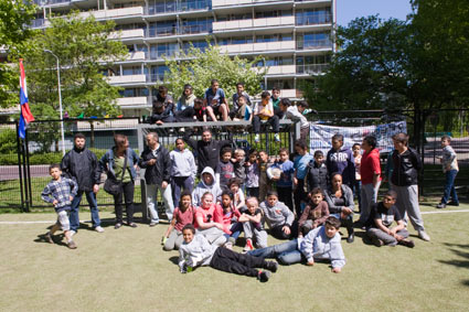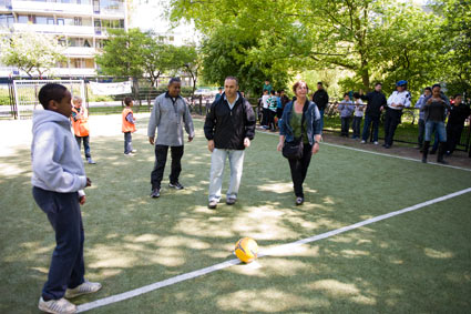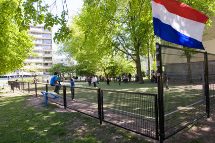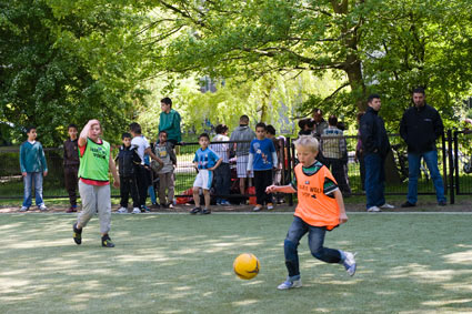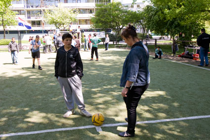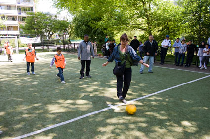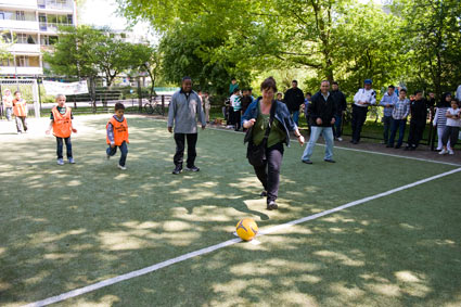SP-wethouder Roos van Gelderen gaf de aftrap bij de heropening van het kunstgrasveldje. (Foto's: Fotostudio D'Andrea).