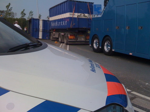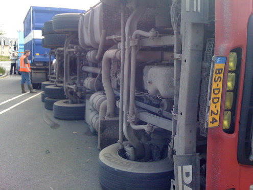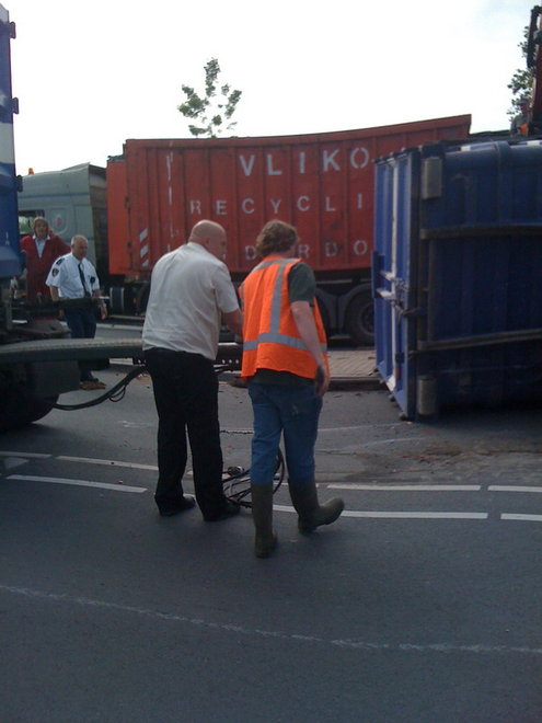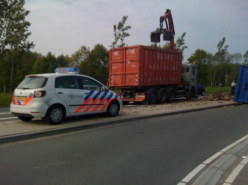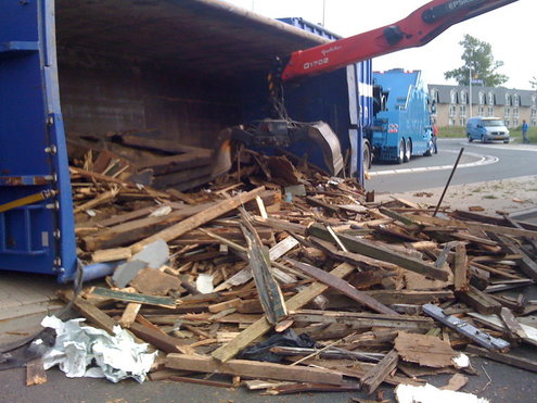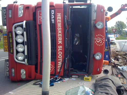 Op de Persant Snoepweg in Leiderdorp is donderdag een vrachtwagen met hout gekanteld. De ravage werd opgeruimd door het Leiderdorpse bedrijf Vliko. De chauffeur kwam er met slechts lichte verwondingen vanaf. De vrachtwagen raakte zwaar beschadigd. (Foto's: Edwin Jordaan).