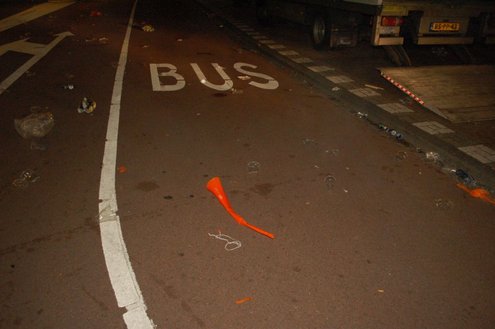 Zie ook het filmpje van Van Aelst over de aftocht, het vuurwerk en de teleurstelling van de fans na de wedstrijd op YouTube.