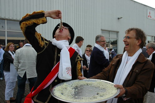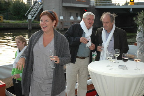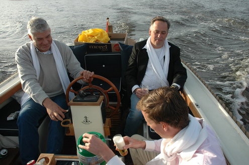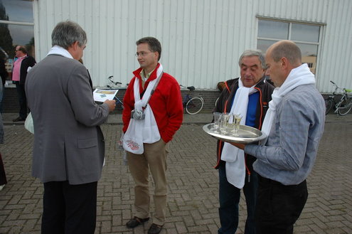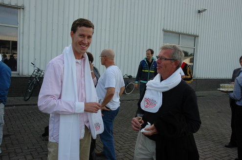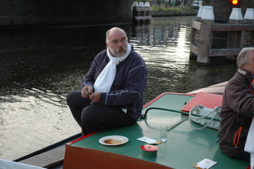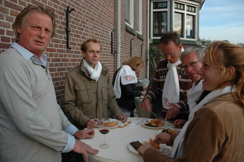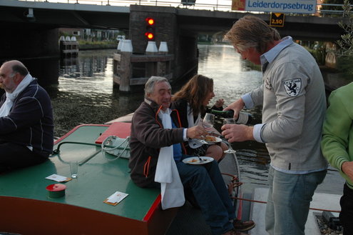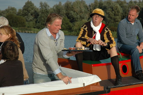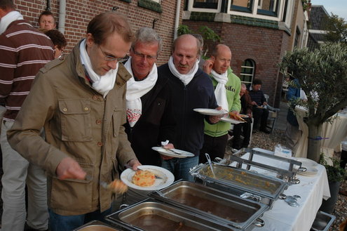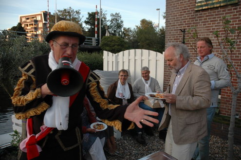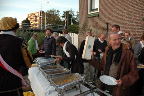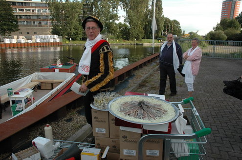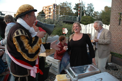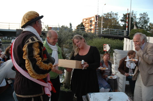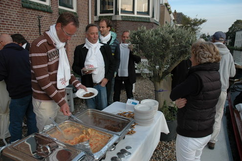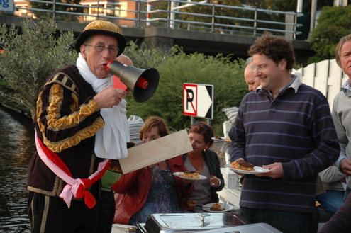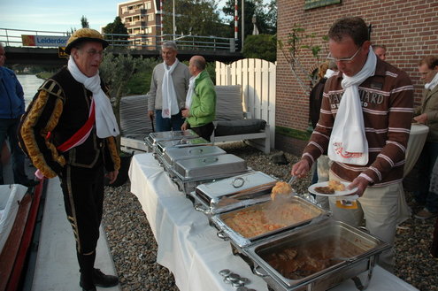 Halverwege de Geuzentocht werd aangelegd voor een Hutspotmaaltijd met klapstuk. Op de grens van Leiden en Leiderdorp stelde accountantskantoor HBK daarvoor hun terras aan het water beschikbaar. Beth Kooreman van HBK zorgde voor de hutspot en kreeg van oppergeus Claas Griffioen als dank een kruik Corenwyn. (Foto's: Chris de Waard).