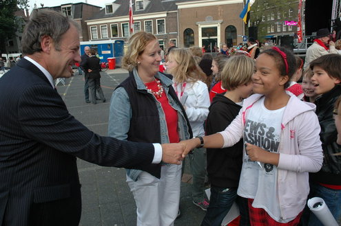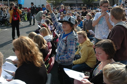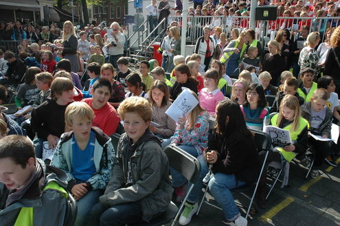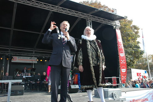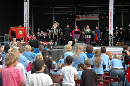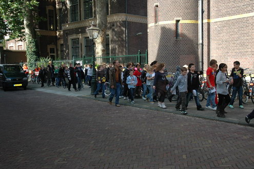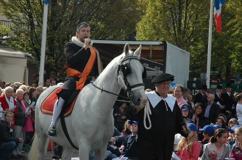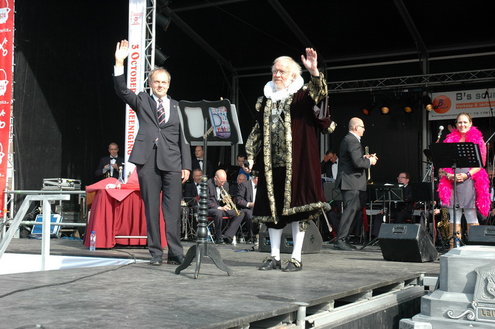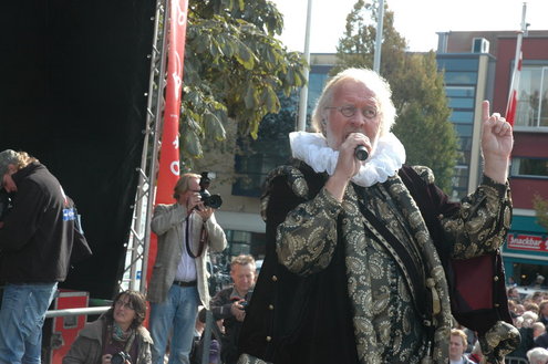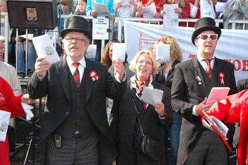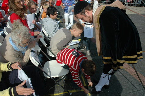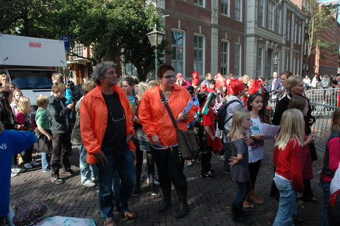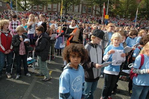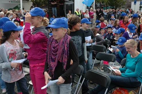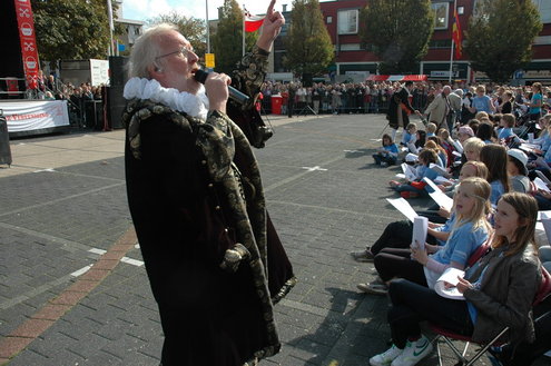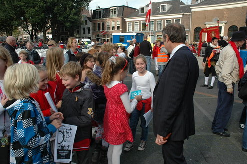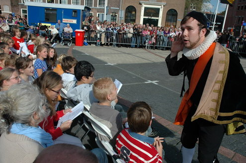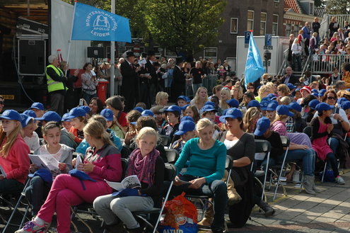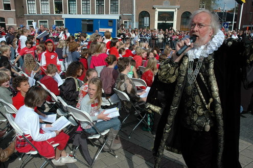 Voor de 18e keer vond vanmiddag op de Garenmarkt het Minikoraal plaats. Het evenement combineert feesten en herdenken voor basisscholieren van meer dan 50 scholen uit Leiden en omgeving. Een uur lang worden bekende liedjes uit het 3 oktober repertoire gezongen, afgewisseld met korte verhalen over de geschiedenis van Leidens Ontzet. Dit jaar was naast ‘Burgemeester Van der Werf’ ook ‘Willem van Oranje’ zelf aanwezig.