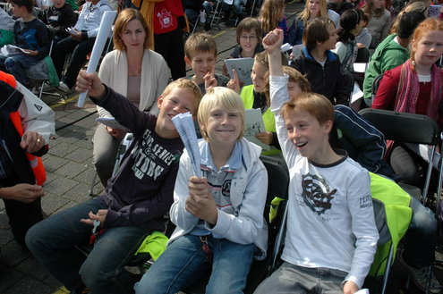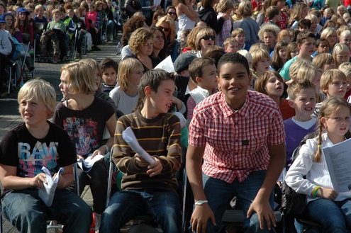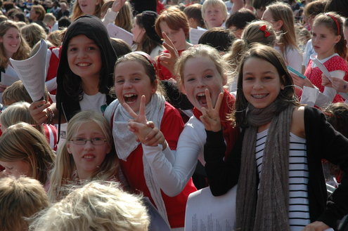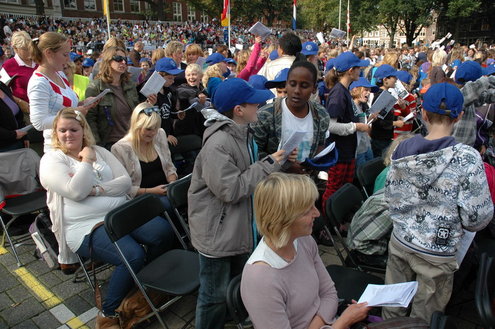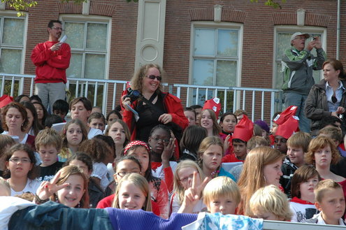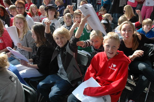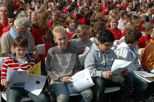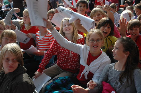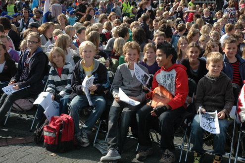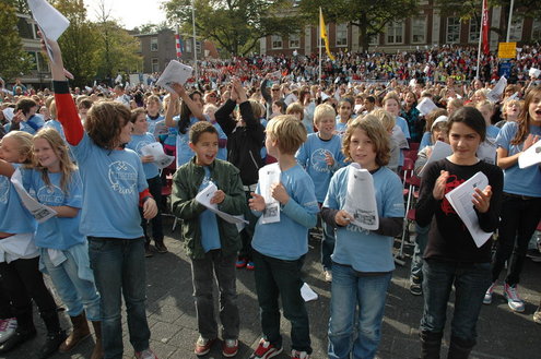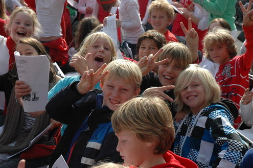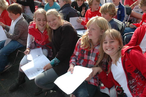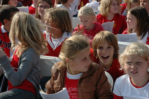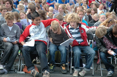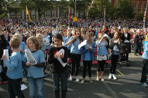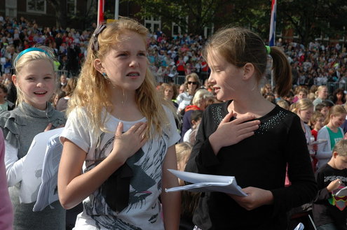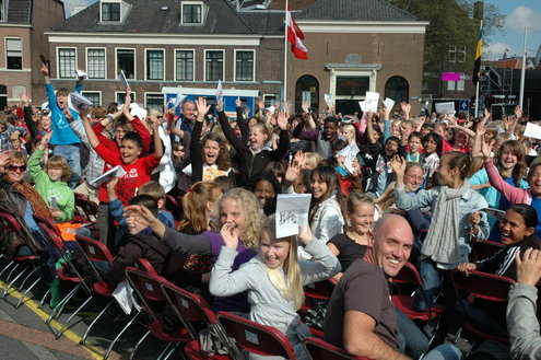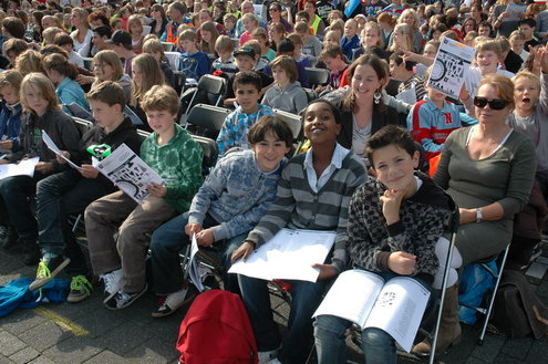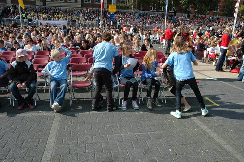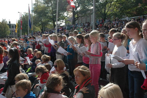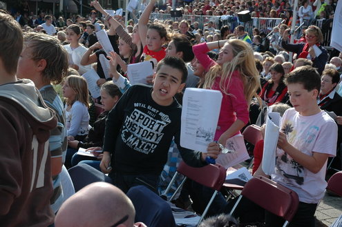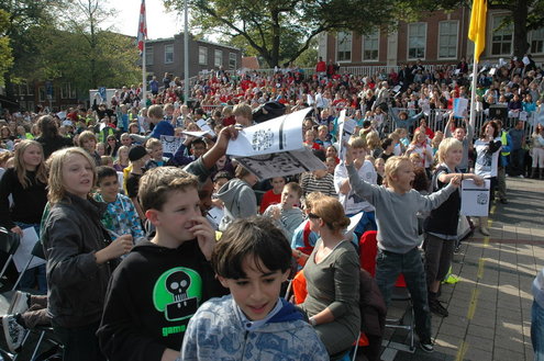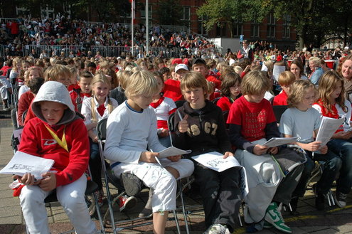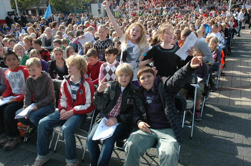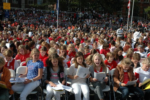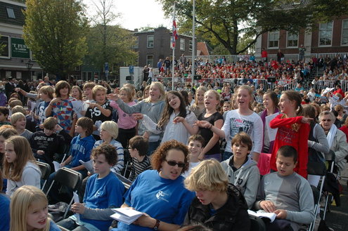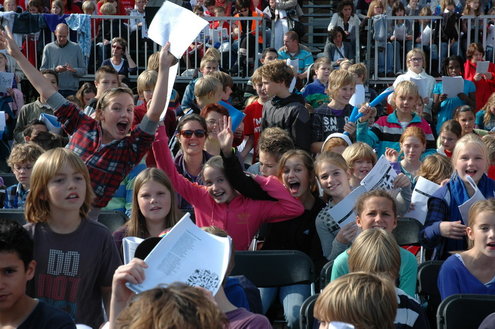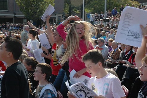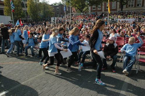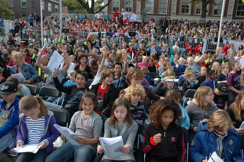 Duizenden kinderen leerden vanmiddag 'zingenderwijs' over de geschiedenis van Leidens Ontzet. Zoals elk jaar weer met heel veel lol. (Foto's: Chris de Waard).