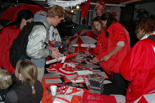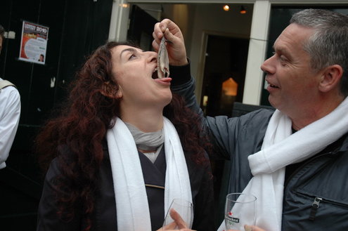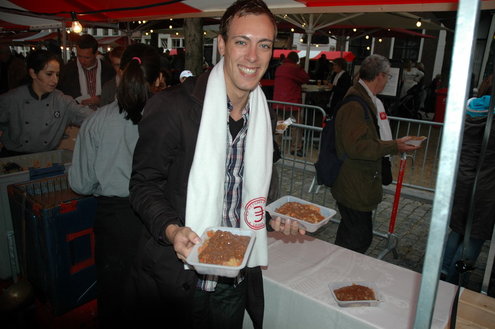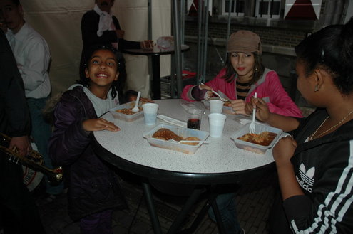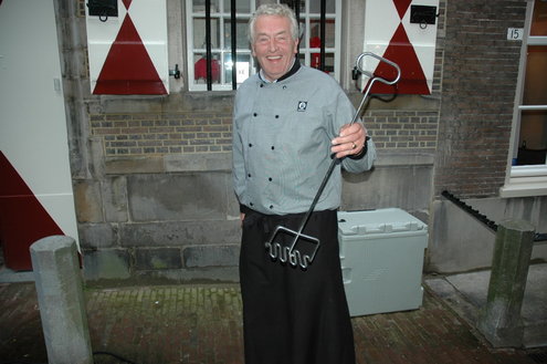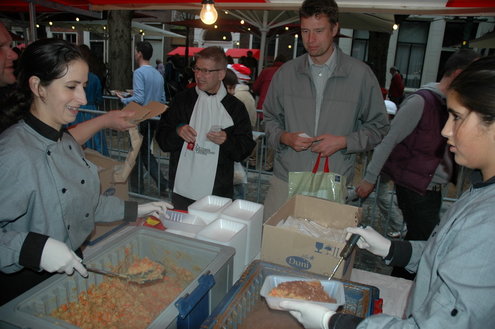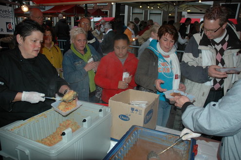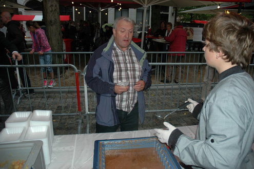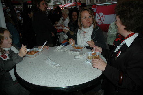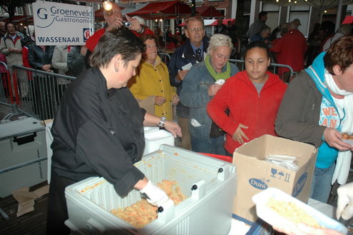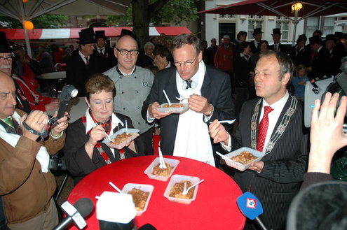 Traditioneel moet de hutspot eerst geproefd worden door de burgemeester en de voorzitter van de 3 October Veereniging. Pas als deze in orde bevonden is, begint het uitdelen. "Het lijkt wel of er meer ui in zit dan andere jaren," vond voorzitter Els van Eijck van Heslinga van de 3 October Vereeniging. (Foto's: Chris de Waard).