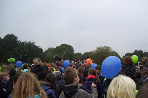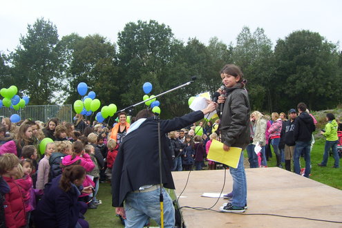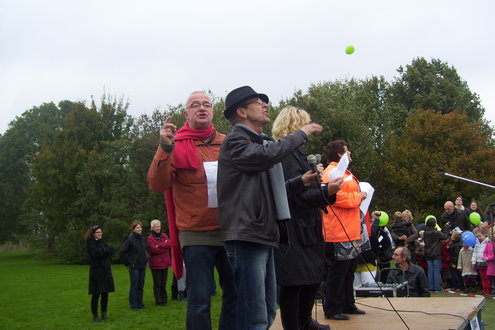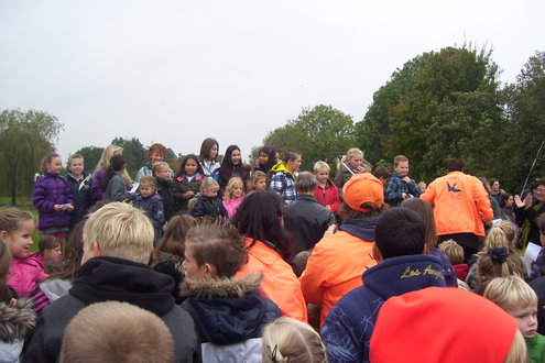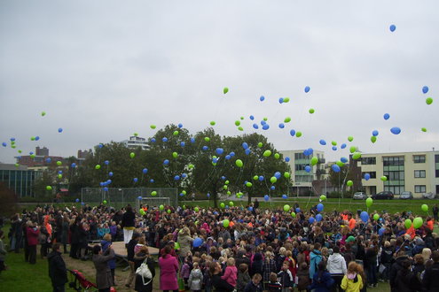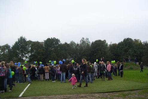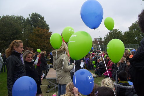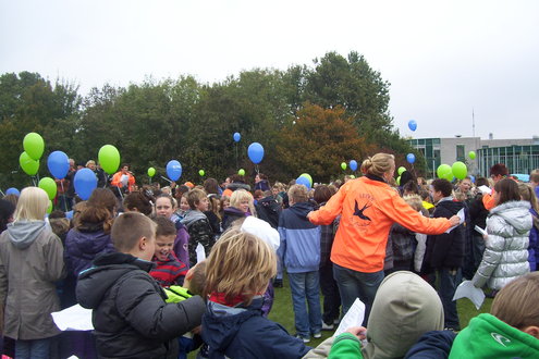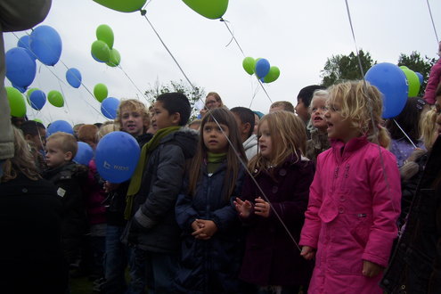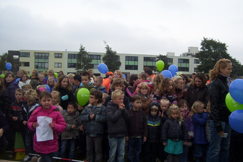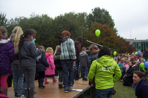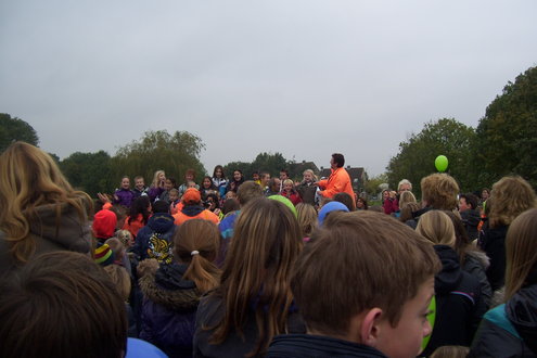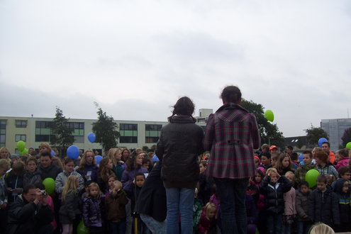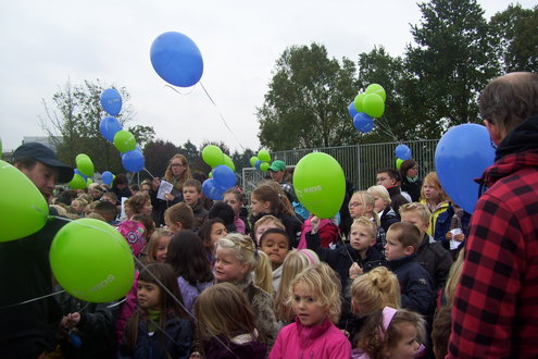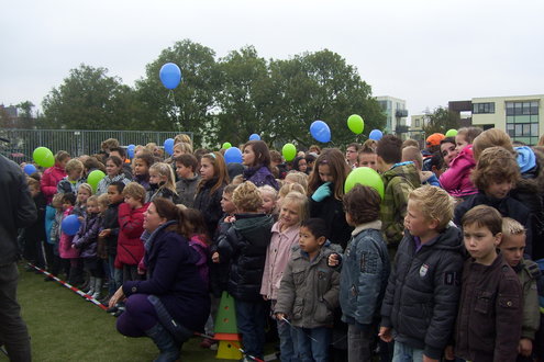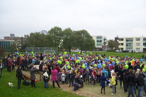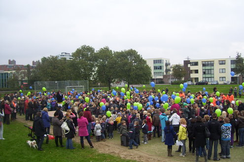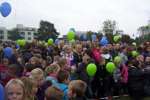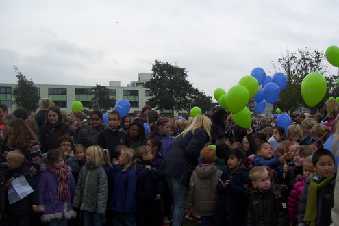 Leiden - 27 oktober 2010 - Vandaag vindt voor de eerste maal de Dag van de Stevenshof plaats, waarbij het thema “Samen in onze wijk”centraal staat. Op alle basisscholen in de wijk werden vanmorgen in dit kader allerlei leuke activiteiten georganiseerd. Om 10.45 uur vertrokken de scholieren naar het Stevenshofpark, waar wethouder Roos van Gelderen op feestelijke wijze het startsein voor het middagprogramma gaf. Kinderen droegen gedichten voor, of zongen liedjes waarin vooral het thema ‘samen’ een belangrijke rol speelde. Daarna werd gezamenlijk het grote Stevenshoflied gezongen en mochten de kinderen eindelijk hun meegebrachte ballonnen loslaten, die de grijze lucht voor even vrolijk kleurden. Na de lunch op school stond een grote speurtocht door het park en pompoen snijden op het programma. (Foto’s: Jacqueline Borg)