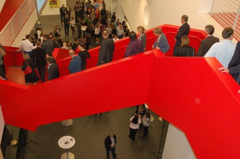 De openinghandeling vond plaats rond de rode trap. Deze trap is het verbindingsstuk tussen de verschillende afdelingen in het gebouw en symboliseert de rode draad in zowel opleiding als gebouw. Bij die opening, door burgemeester Lenferink, hoorde een openingsact: jongeren die van de trap kwamen jumpen. Verder waren er toespraken van de voorzitster van de raad van bestuur en de directeur van De Raad Bouw dat de uitbreiding uitvoerde. De Raad Bouw schonk de hogeschool een kunstwerk dat bestaat uit vijf schapen voor de binnentuin. Vier witte en één zwarte. Na afloop kregen alle aanwezigen een verrekijker mee onder het mom: “Ver(re)rijk je blik met Hogeschool Leiden”.