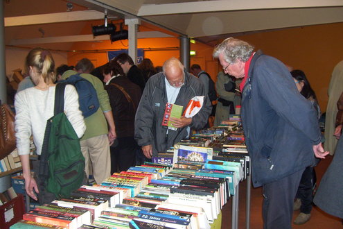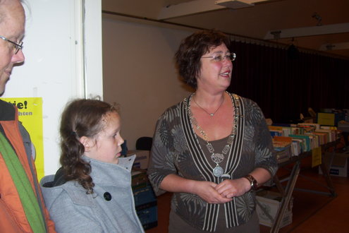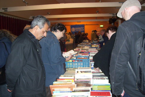 Vandaag is de jaarlijkse boekenmarkt in de Tuinzaal van de Burcht weer van start gegaan. Wethouder Roos van Gelderen verrichtte de opening met een korte toelichting op het belang van het goede werk van Amnesty International. De wethouder hield het kort, want de kopers stonden al te trappelen van ongeduld, gewapend met enorme boodschappentassen. De boekenmarkt is nog tot vanavond 21.00 uur geopend en morgen van 10.00 tot 17.00 uur. Morgen gaan alle boeken voor de halve prijs, dus de meesten voor € 1,-, de tas in. De organisatie hoopt op een mega opbrengst. (foto’s: Jacqueline Borg)