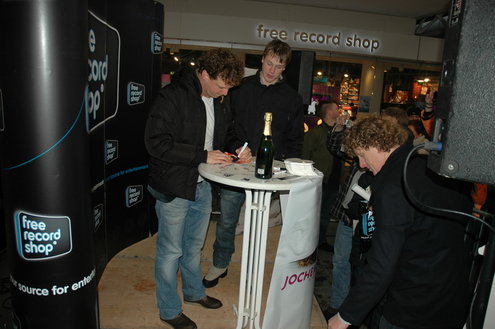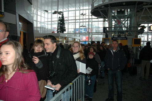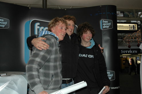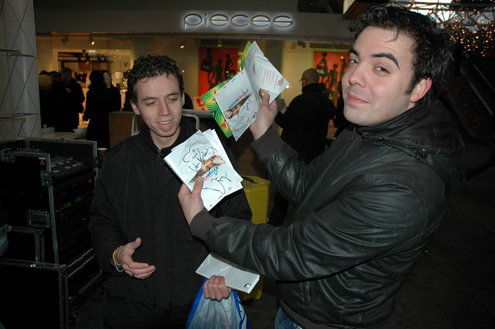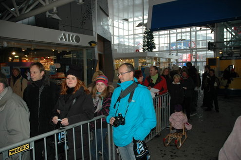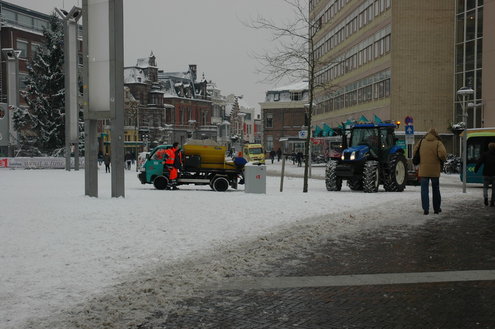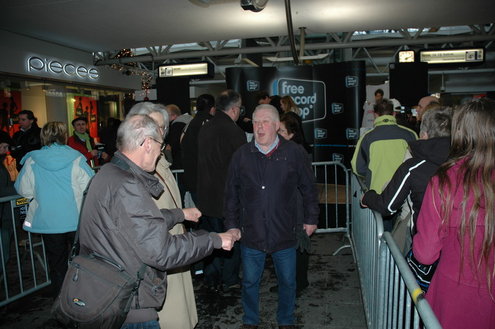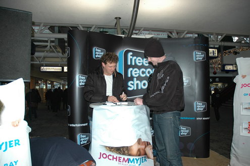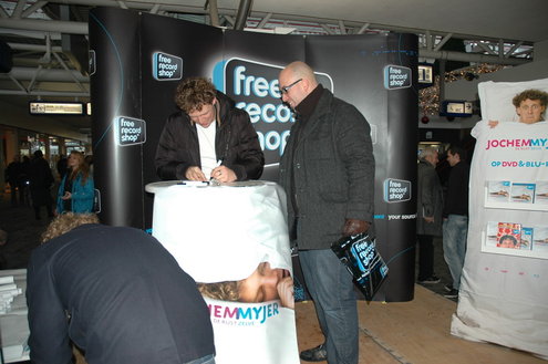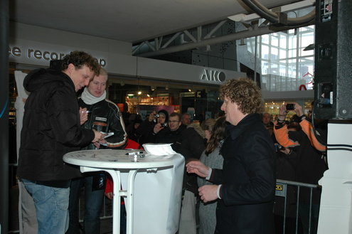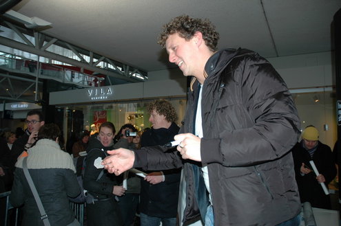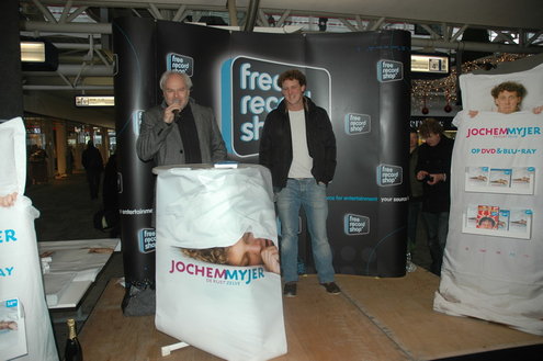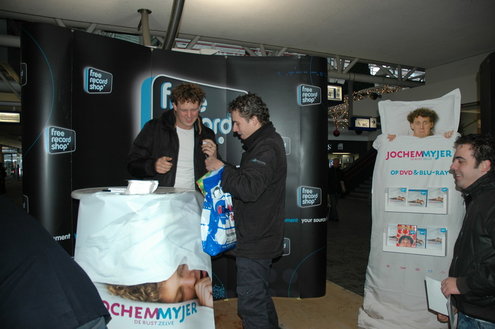 Je moest er vandaag wel wat voor over hebben, maar wie zich door de sneeuw een weg naar station Leiden Centraal wist te banen, werd niet teleurgesteld. Ook de Leidse komiek Jochem Myjer had zich niet door het weer laten weerhouden. Dat gold ook voor de Leidse dichter Nico Dijkshoorn van wie Myjer het eerste exemplaar kreeg van de dvd/bluray ‘De Rust Zelve’. In de ijskoude stationshal stonden honderden mensen in de rij voor een foto en een handtekening. Overigens hielp de gemeente nog wel een handje door het Stationsplein zo goed en zo kwaad als het ging sneeuw- en ijsvrij te krijgen.