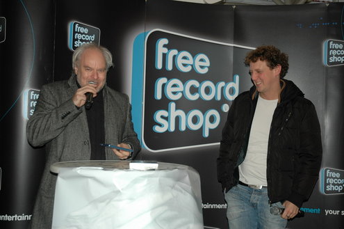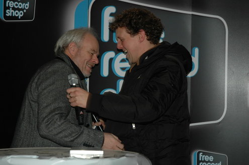 Twee Leidse grootheden trotseerden vandaag de gladheid. Nico Dijkshoorn overhandigde Jochem Myjer het eerste exemplaar van de dvd/bluray 'De Rust Zelve'. (Hoofdfoto: Jordy Kortekaas, repo: Chris de Waard, video: Emile van Aelst).