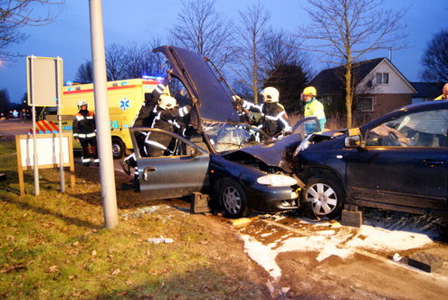 Bij een frontale botsing raakten gistermiddag drie mensen gewond. De brandweer moest één van hen uit het wrak zagen. (Foto's: Marc Wonnink).