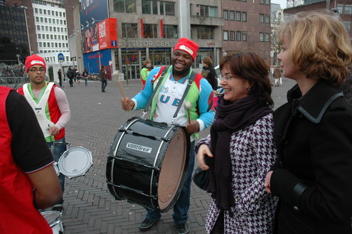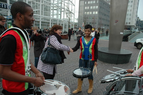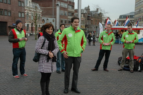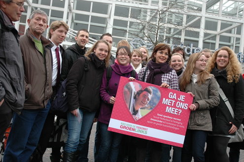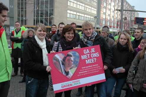 Met nog ruim twee weken te gaan tot de provinciale statenverkiezingen halen veel partijen alles uit de kast om hun standpunten onder de aandacht te brengen. Zo ook GroenLinks die vanmiddag voorzitter Jolande Sap van de Tweede Kamerfractie van die partij op liet draven om bij station Leiden Centraal de OV-wensen van GroenLinks over te brengen aan de treinreizigers. Ook ging ze in gesprek met studenten van de Hogeschool Leiden die een meet & greet hadden gewonnen.