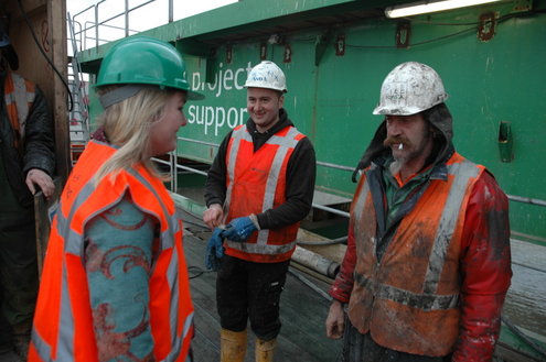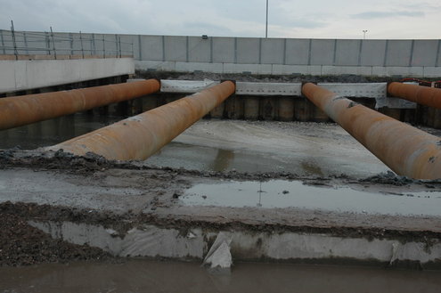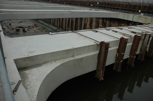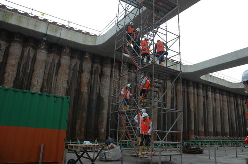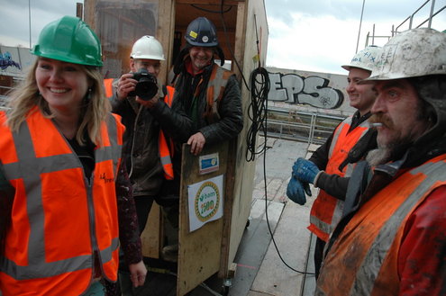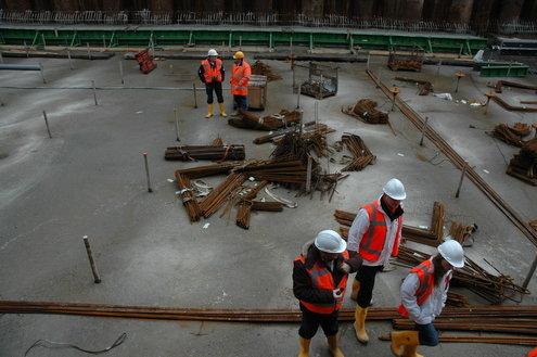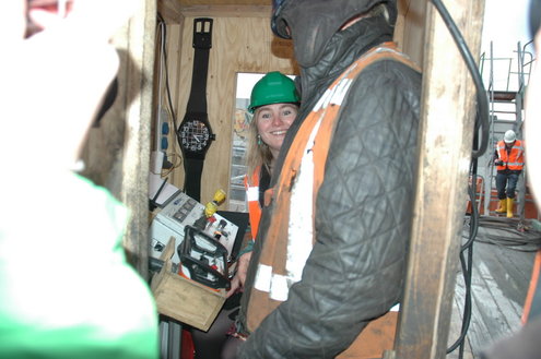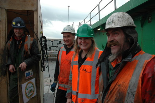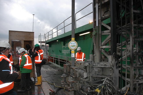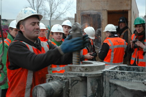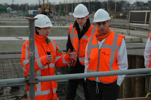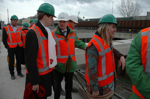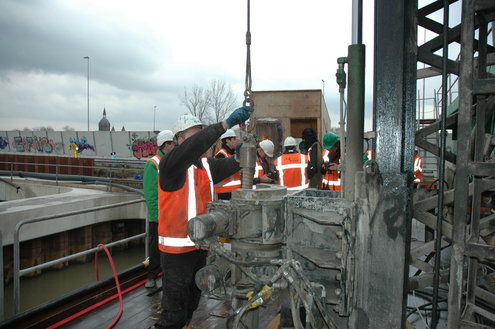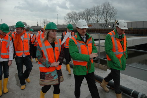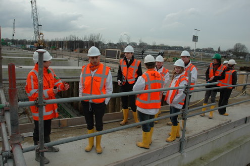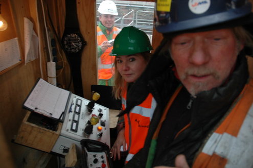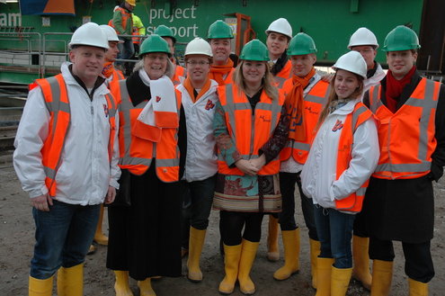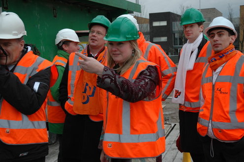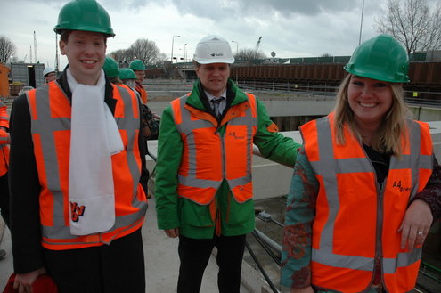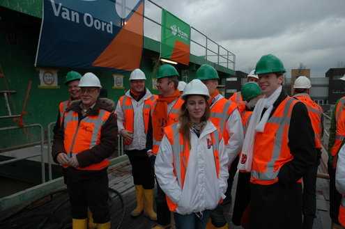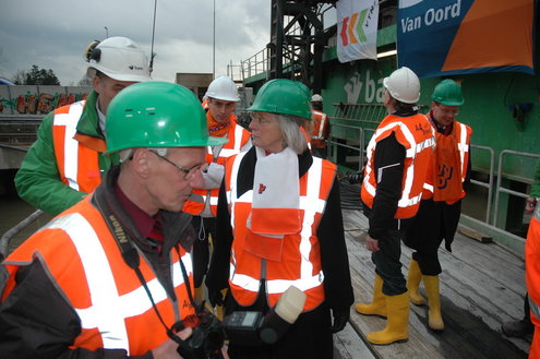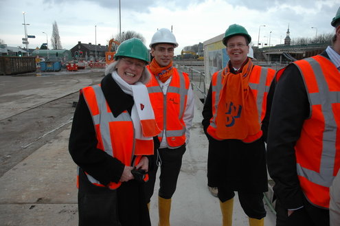 "Om de economie weer in beweging te brengen, moet je Zuid-Holland weer in beweging brengen. De aanpak van de A4 als economische ader van de Randstad is daarom hard nodig. De weg is nu nog gebaseerd op de verkeersbewegingen van 1960." Dat zei minister Melanie Schultz (VVD, Infrastructuur en Milieu) vanmiddag tijdens een werkbezoek in Leiden dat in het teken stond van de provinciale VVD verkiezingscampagne. Daarbij plaatste ze de 2500e van 8000 zogenaamde stempels. Dat zijn metalen schijven die met draadstaal in de betonnen fundering van de tunnelbak worden geplaats om de boel op z'n plek te houden. (Foto's: Chris de Waard).