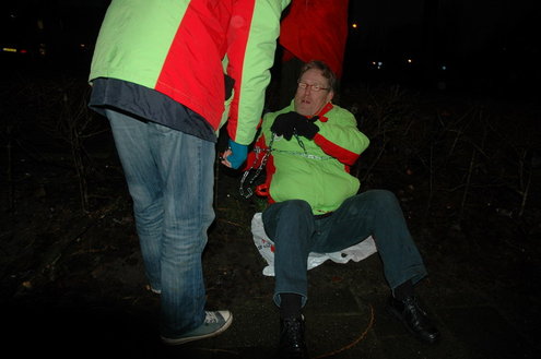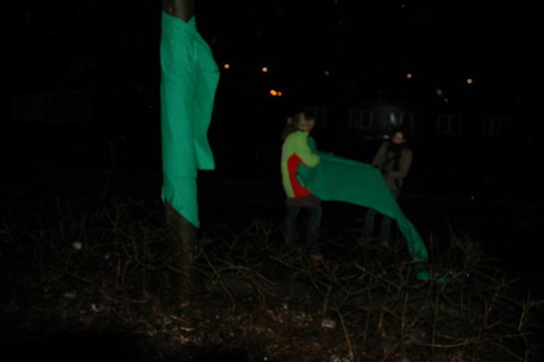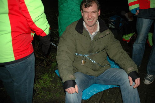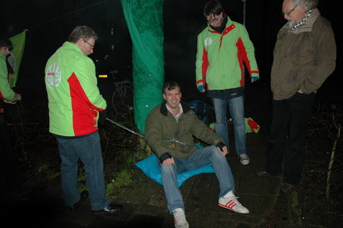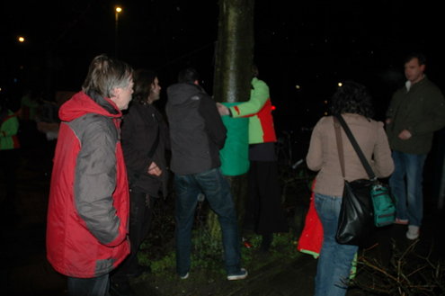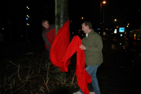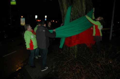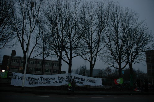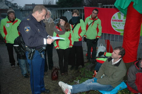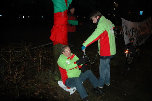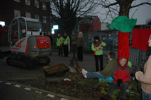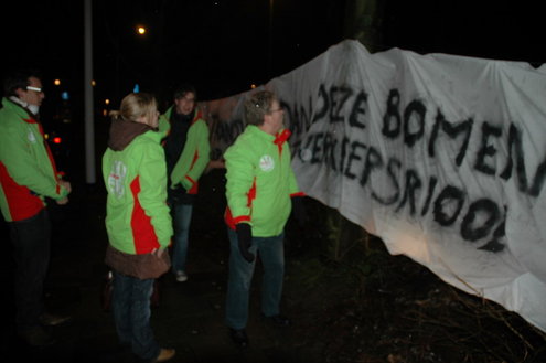 GroenLinks Leiden heeft vanmorgen vanaf 7.00 uur actie gevoerd tegen de voorbereidende werkzaamheden die de gemeente laat uitvoeren voor de bouw van een tijdelijke parkeergarage tegenover de Morspoort. Tegen de komst van die garage lopen nog procedures van omwonenden. De vandaag gestartte werkzaamheden vindt GroenLinks dan ook voorbarig. Fractievoorzitter Pieter Kos, statenlid Alfred Blokhuizen, oud-wethouder John Steegh en fractieassistent Jos Olsthoorn lieten zich aan enkele bomen vastketenen om zo te voorkomen dat de wortels werden ingekort.