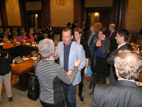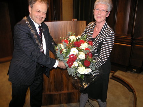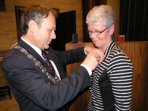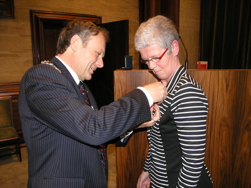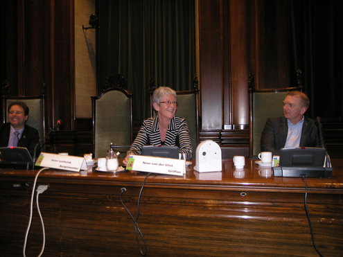 Dinsdag op de kop af 40 jaar geleden trad Els Visser als secretaresse van wethouder Bram Kret (PC) in dienst van de gemeente Leiden. Inmiddels is Noor van der Vlist, zoals ze tegenwoordig door het leven gaat, alweer sinds de invoering van het dualisme in 2002 de eerste raadsgriffier van de gemeente en bezig aan haar laatste periode, zoals ze dat zelf noemt. Die periode slaat op de collegeperiode van vier jaar die in 2014 afloopt. Toevallig ook een periode waarin de PvdA niet in het college zit. Net als 40 jaar geleden toen ze kwam. Ter ere van dat 40-jarig dienstverband hield de Leidse raad een speciale gemeenteraadsvergadering waarbij werd stilgestaan bij het jubileum. Achtereenvolgens hielden burgemeester Lenferink en vice-voorzitter Greetje van Gruting van de raad een uigebreide lofzang over de vele verdiensten van Van der Vlist voor de gemeente Leiden. Het bleef niet bij mooie woorden alleen. Als bijzondere blijk van waardering kreeg ze de gouden speld voor ambtenaren opgespeld.
