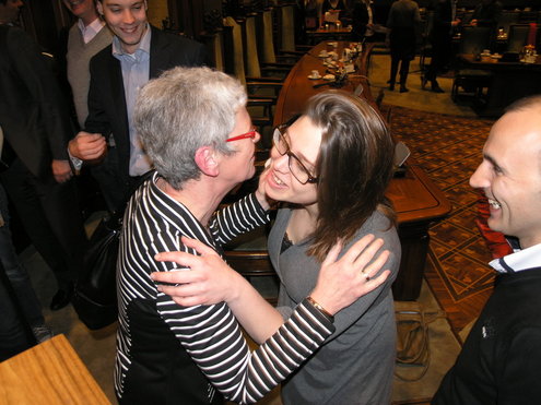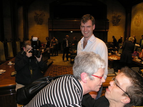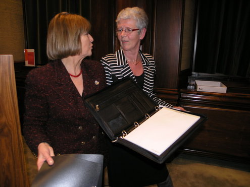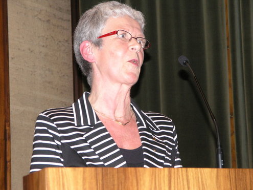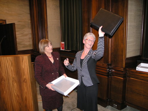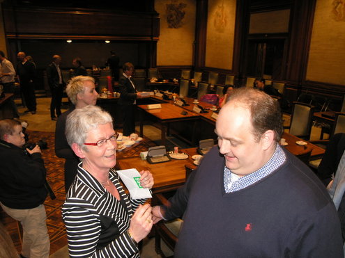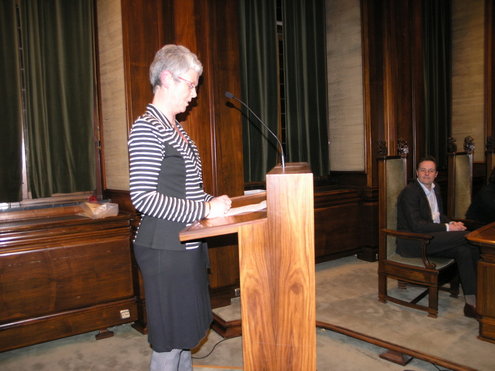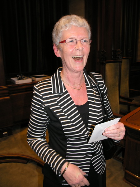 Al 40 jaar is Noor van der Vlist niet alleen gewoon in dienst van de gemeente Leiden, maar is ze een belangrijke spil in de gemeentelijke organisatie. Nadat ze de gouden speld uitgereikt had gekregen, bedankte de 'raadsgriffeuse' haar medewerkers en iedereen die met haar samenwerkt uitgebreid: "Ik ben niet de makkkelijkste om mee samen te werken. Dat weet ik best, want ik wil altijd gelijk hebben." (Foto's: Chris de Waard).