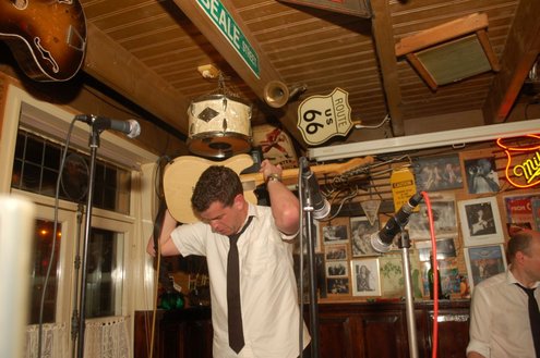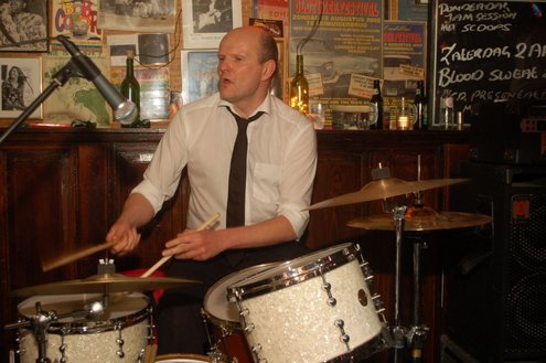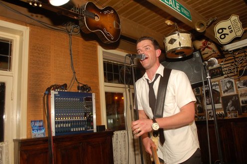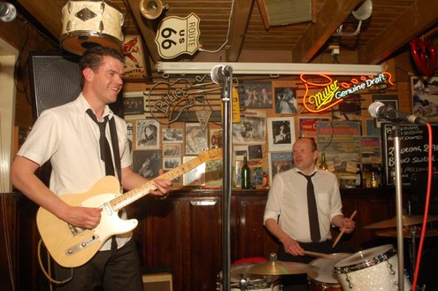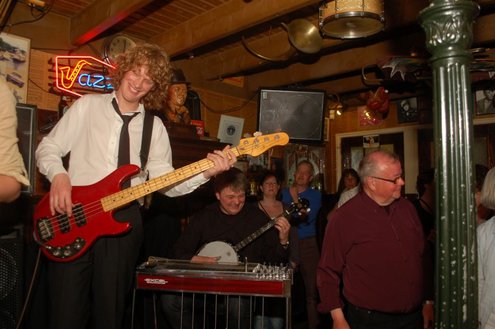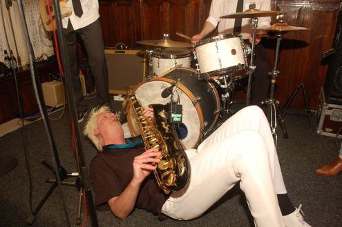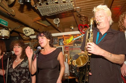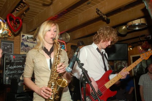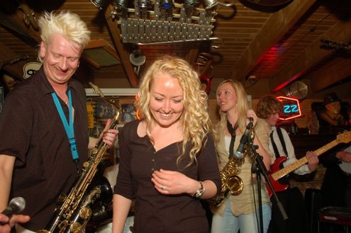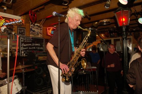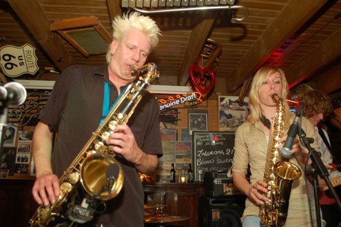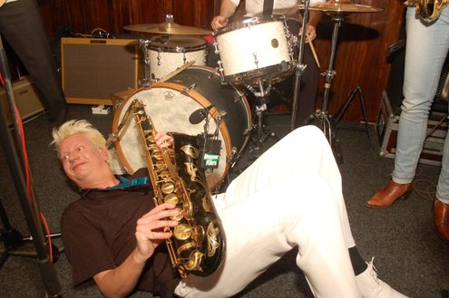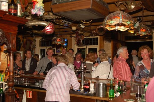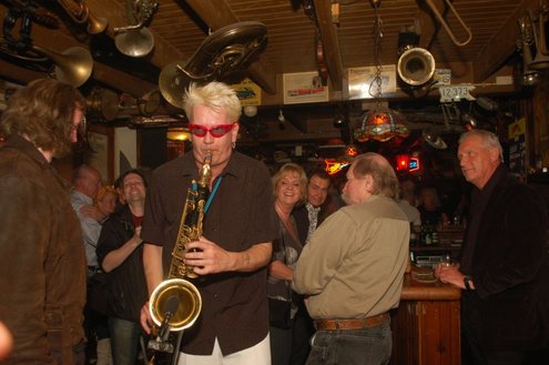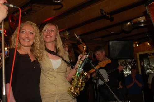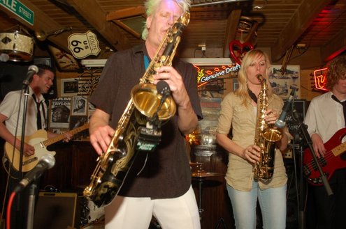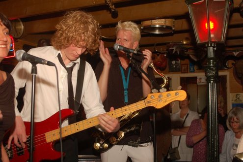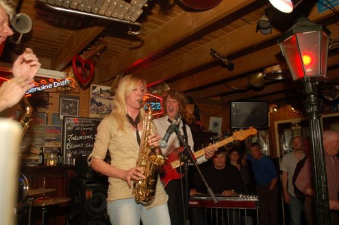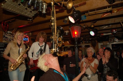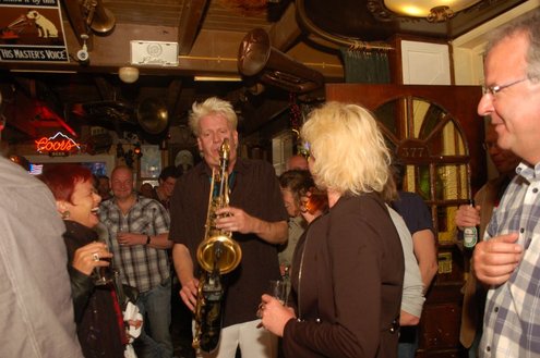 Afgelopen zaterdag presenteerde de Leidse band Blood Sweat & Kiers hun nieuwe CD met de titel ‘Mr Sax Man’ in café Ruimzicht in Leimuiden. Het gezellige café wordt ook wel Rooie Kees genoemd naar de uitbater van het etablissement. Onder grote belangstelling, waaronder ook veel Leidse fans, werd het eerste exemplaar aan Rooie Kees overhandigd. Op het nieuwe album versterken de Eel Mere Ladysingers de band en ook bij de presentatie waren de dames zingend en swingend van de partij. (Foto’s: Emile van Aelst)