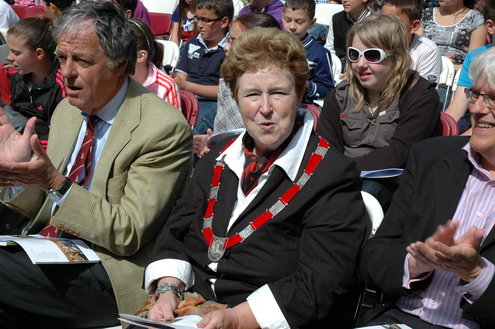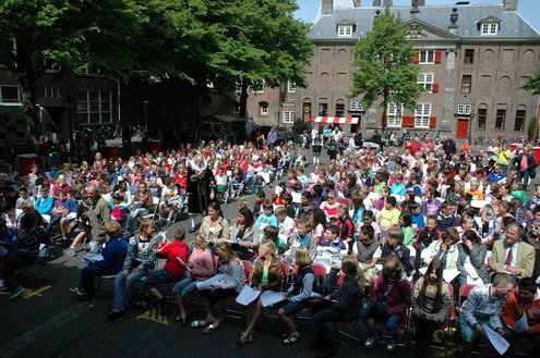 Het was vrijdagmiddag een soort mini Minikoraal op het Pieterskerkplein waar een paar honderd scholieren de zes liedjes ten gehoren brachten. Topper was de nieuwste 3 oktoberhit 'Vrijheid Verlicht'. (Foto's: Chris de Waard, video Emile van Aelst).
