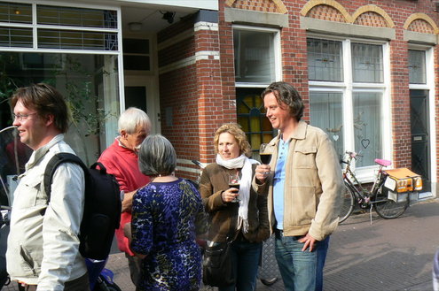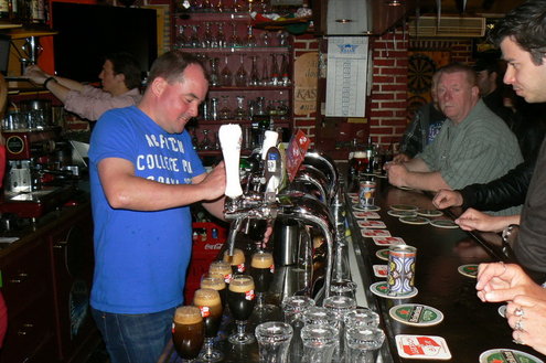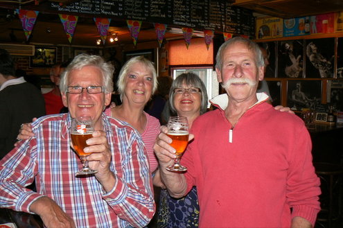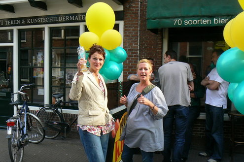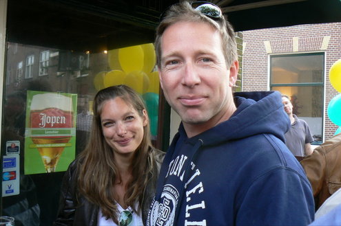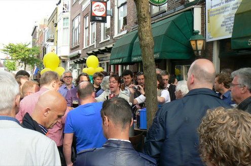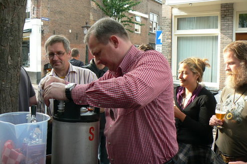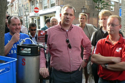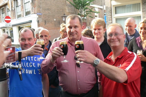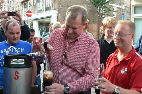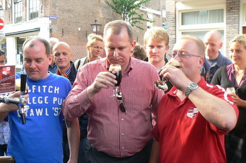 Lambert Vos (rechts) van Lemmy's en brouwmeester Jan-Willem Fukkink (midden) proosten op het nieuwste Leidse biertje: de Morsporter. (Foto's: Marjo Heemskerk).