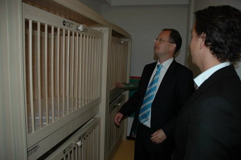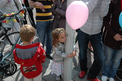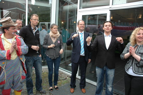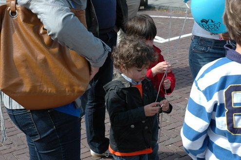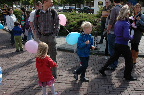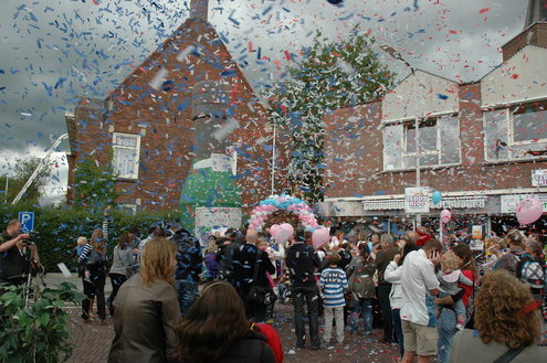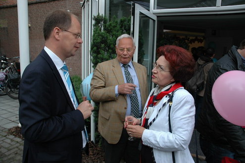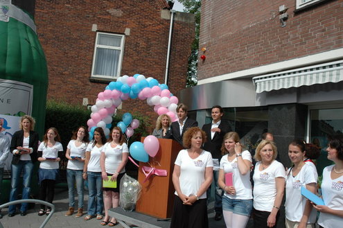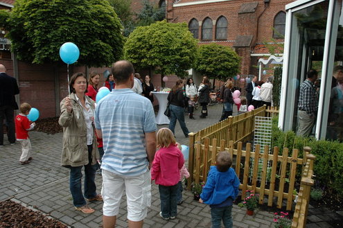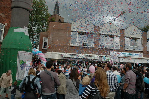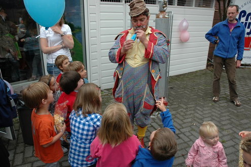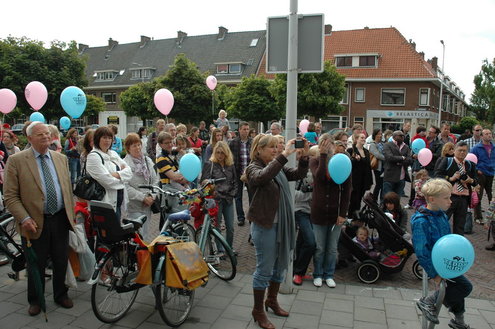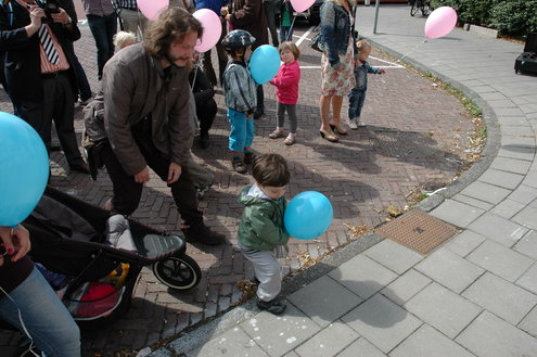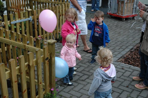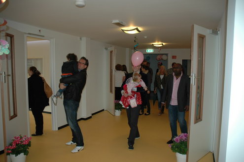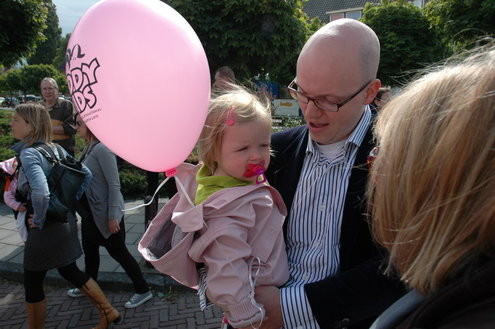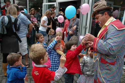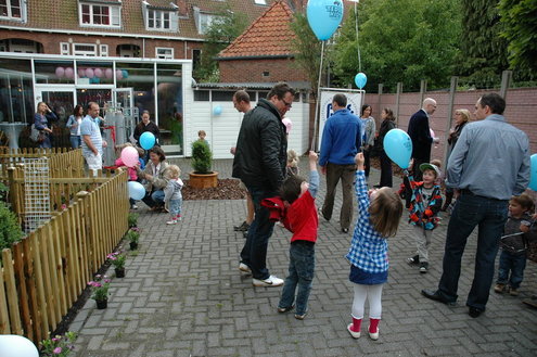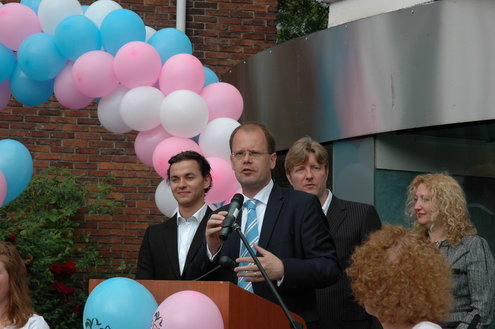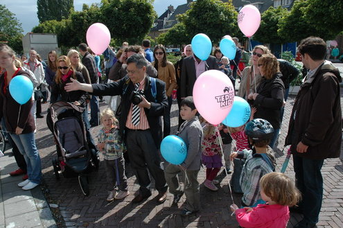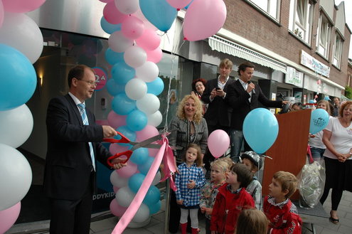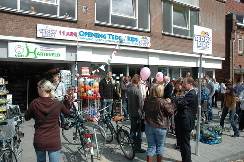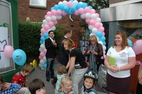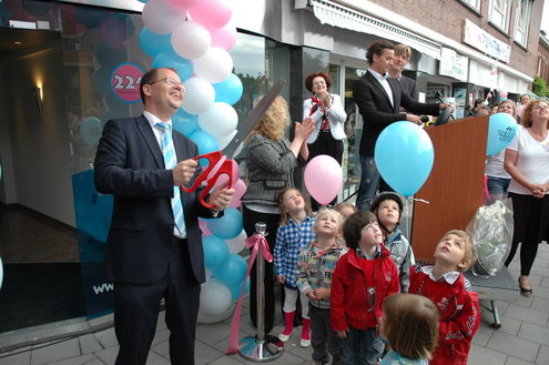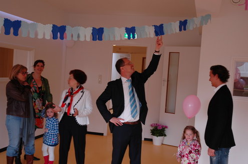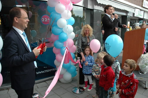 VVD-wethouder Pieter van Woensel mocht vanmorgen het lintje knippen bij de nieuwe vestiging van Teddy Kids aan de Zeemanlaan: "We maken ons sterk voor kinderopvang in de wijk en ik ben blij dat dat nu ook hier in de professorenbuurt kan." (Foto's: Chris de Waard).