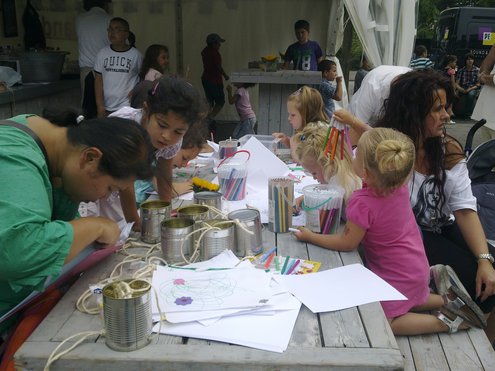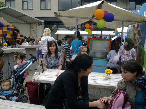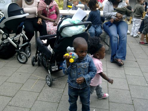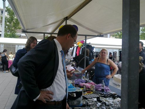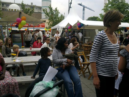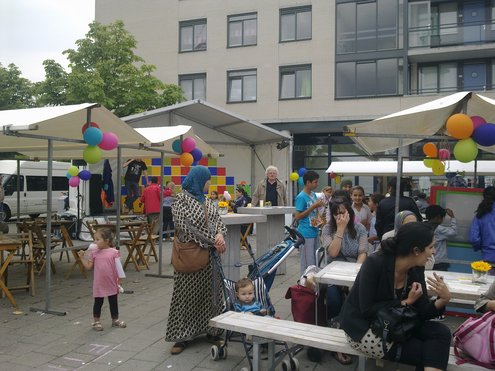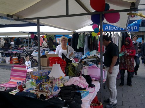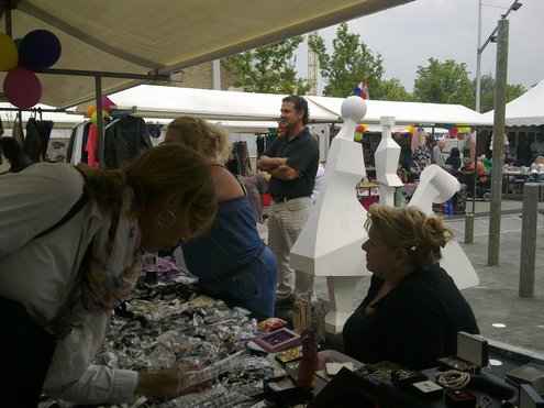 Het ietwat drukkende weer gaf de gezellige markt afgelopen middag op het Kooiplein nog een extra tropisch tintje. Wethouder Pieter van Woensel hield een praatje, waarin hij de toekomst van het plein als bruisend hart van Leiden-Noord aanhaalde. Naast Van Woensel legden de directeuren van de Sleutels en Proper-Stok de ontwikkelplannen voor het Kooiplein uit. Behalve allerlei informatiekraampjes, waarin onder andere die toekomstvisie op foto’s en maquettes te zien was, werden er vooral veel nieuwe en oude leuke spulletjes verkocht. Op de verschillende terrasjes was het goed toeven en de kinderen werden vrolijk vermaakt vanaf het podium of konden knutselen aan een van de grote tafels. (Foto’s: Jacqueline Borg)
