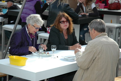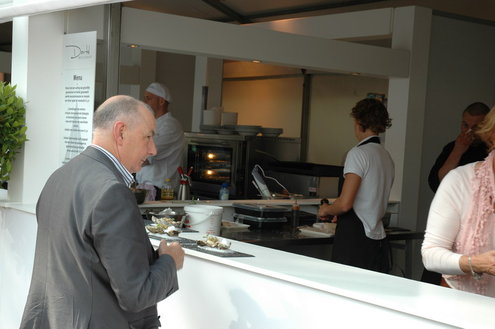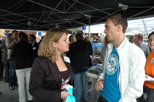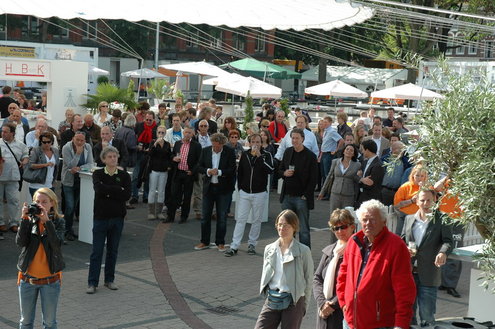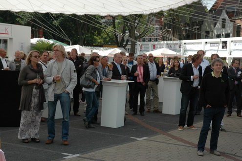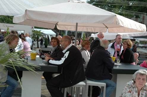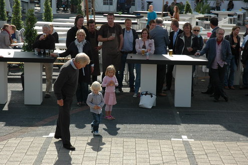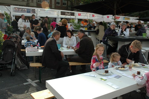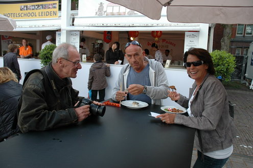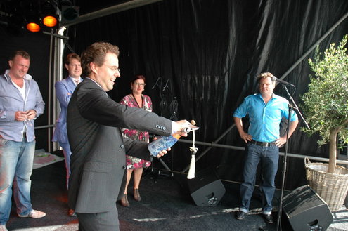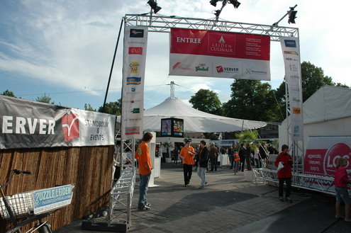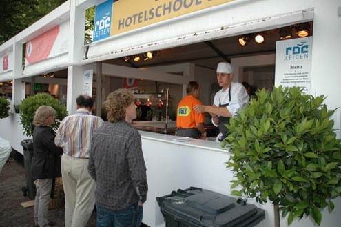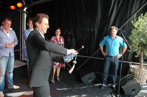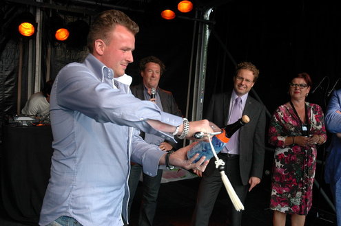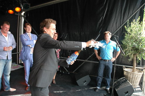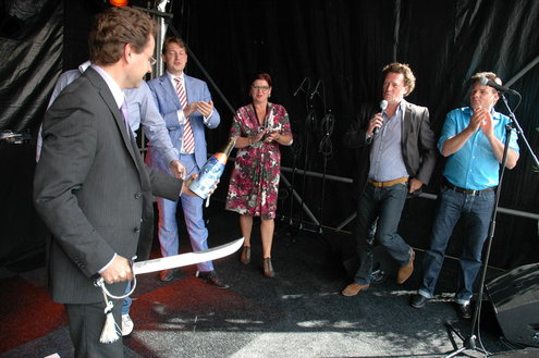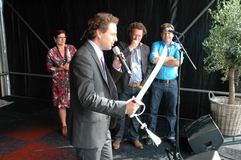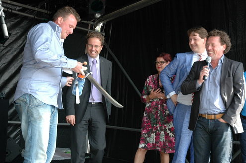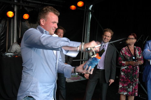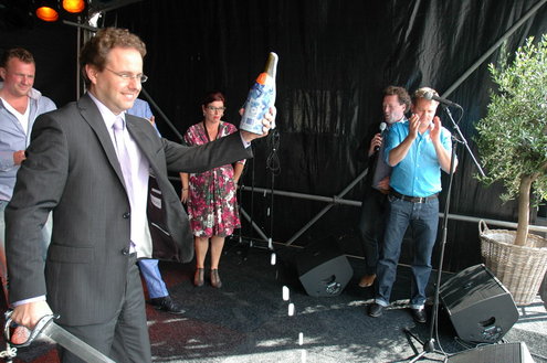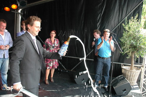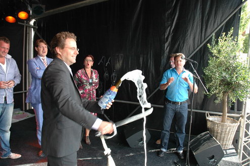 Wethouder Jan-Jaap de Haan opende gistermiddag de 25e editie van Leiden Culinair op de Garenmarkt: "Een plek om elkaar te ontmoeten en te genieten van het mooiste terras van Leiden. Het ziet er mooier uit dan ooit," aldus de wethouder die met het sabreren van een fles Champagne de officiële openingshandeling van het culinaire festijn verrichtte. Leiden Culinair duurt nog tot en met zondag. (foto: Chris de Waard).