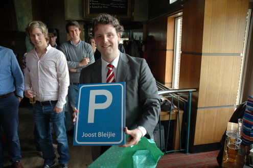 Bij zijn afscheid kreeg Bleijie onder andere een parkeerbord met zijn naam erop. Als centrummanager klaagde hij regelmatig over Leiden als onbereikbare stad waar bezoekers niet kunnen parkeren. Iets dat hem niet door iedereen in dank werd afgenomen. (Foto's: Chris de Waard).