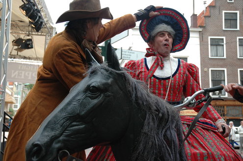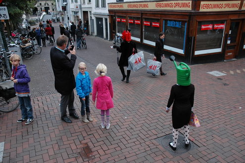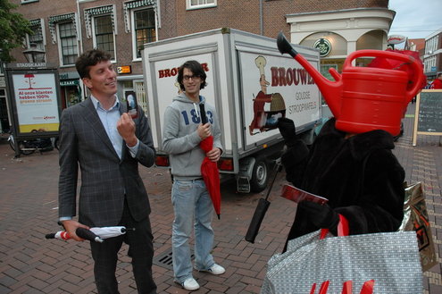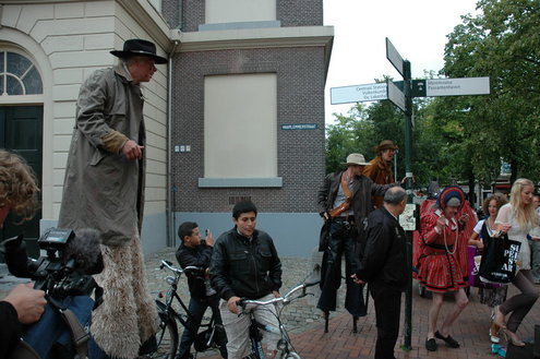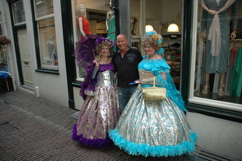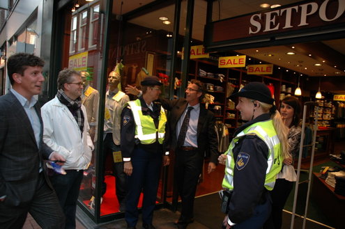 De nieuwe centrummanager Erwin Roodhart omringd door enkele dames van het promotieteam dat de eerste Leidse Moonlightshopavond op de kaart moest zetten. Gisteren waren ze ook al druk in de weer om het publiek er rondom de peurbakkentocht op te wijzen dat ruim 100 centrumwinkeliers hun deuren deze vrijdagavond zouden openen. (Foto's: Chris de Waard, video: IloveLeiden.com).