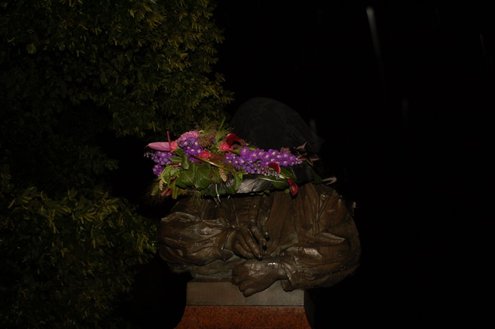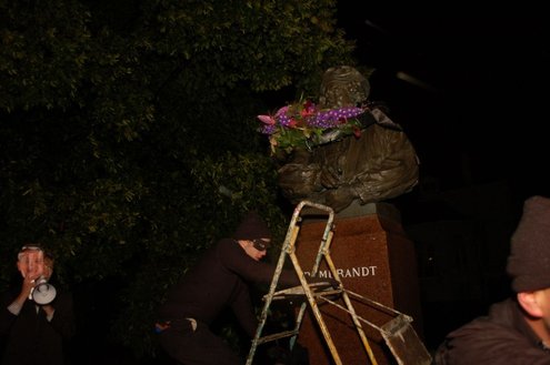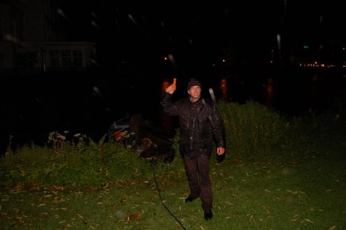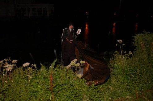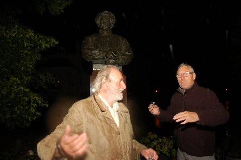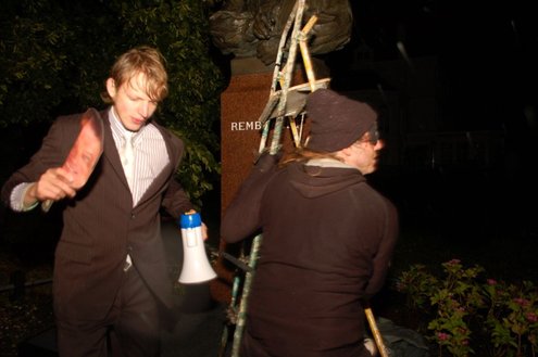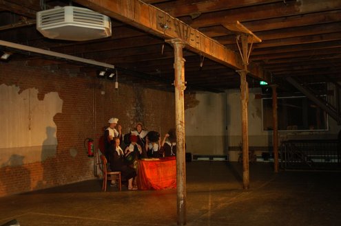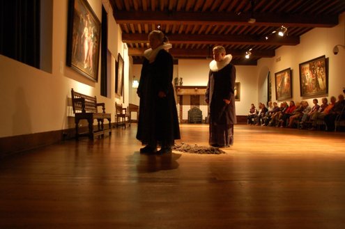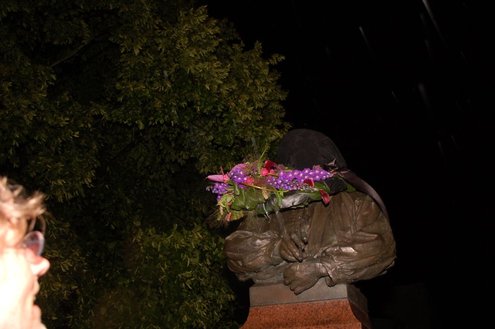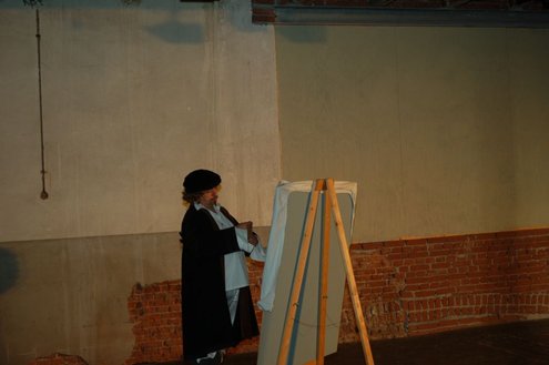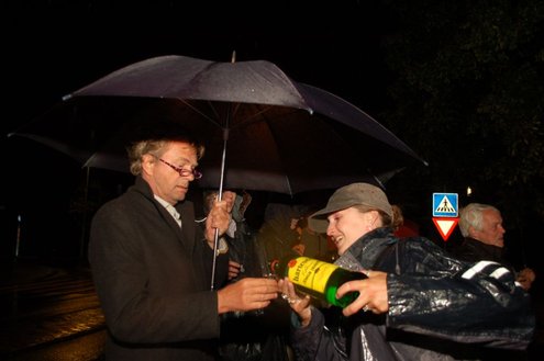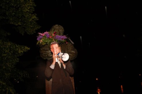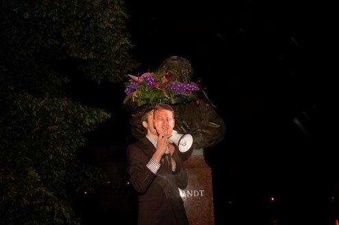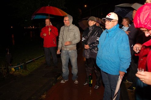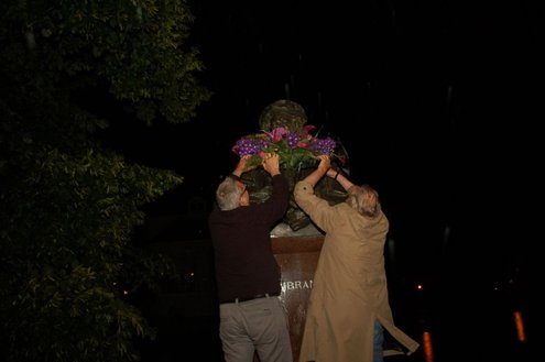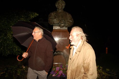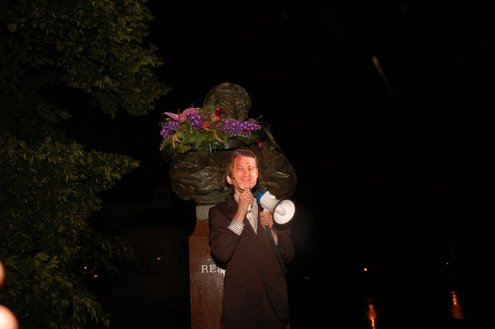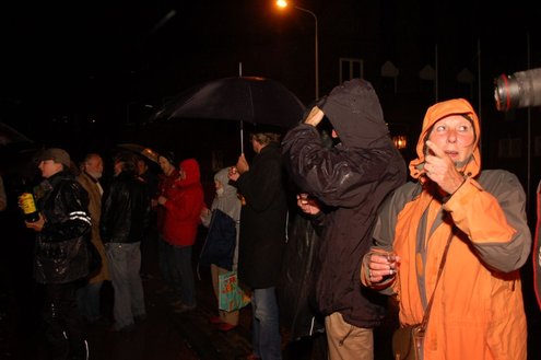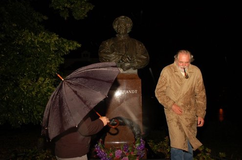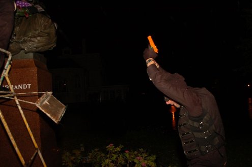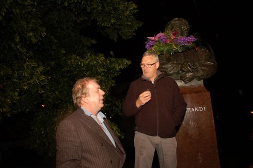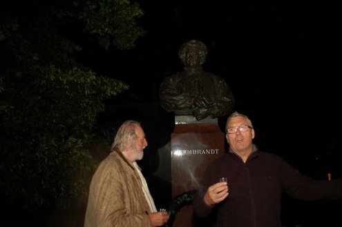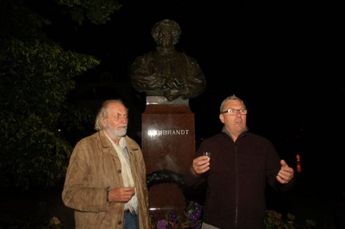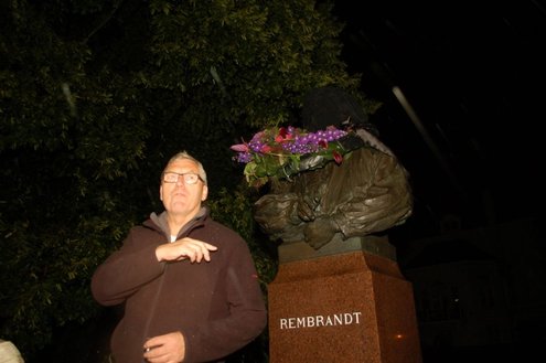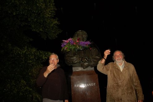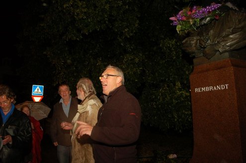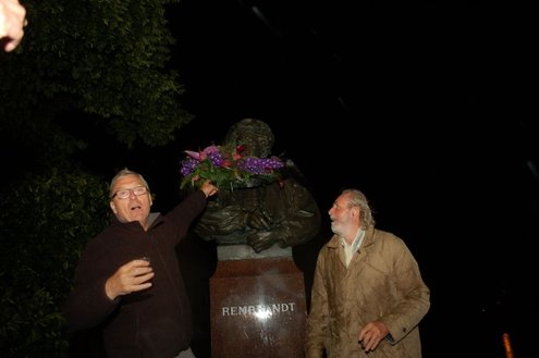 De Nacht van Rembrandt werd gisteren vanwege het slechte weer in de Lakenhal en bij het Scheltema Complex gehouden. Alle inschrijvers konden dat besluit waarderen en waren present. Omdat het beeld van Rembrandt niet in de Lakenhal kon komen, vond de kranslegging wel plaats in weer en wind. Nadat het publiek samen met initiatiefnemers Tjeerd Scheffer en Ben Walenkamp het glas had geheven op de Witte Singel, verscheen plotseling “staatssecretaris Halbe Zijlstra”, die met behulp van een megafoon zijn cultuurboodschap uitschreeuwde: “Rembrandt is dood en oude cultuur levert toch niets op!”. Daarop verschenen twee van zijn commando’s per boot, die in het kader van de cultuurbezuinigingen Rembrandt een zwarte doek over zijn hoofd trokken en fusilleerden. Het publiek bleef verbluft achter.