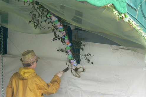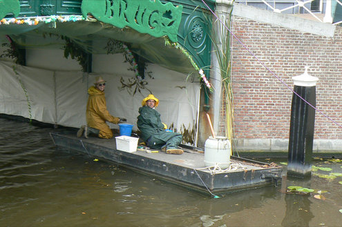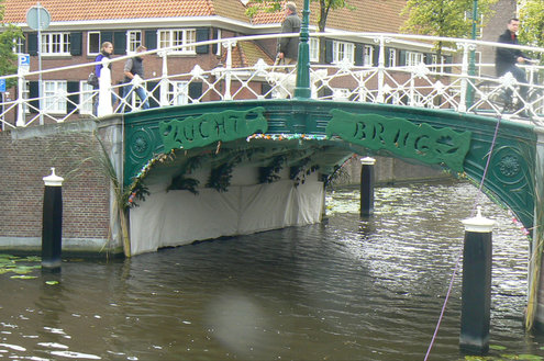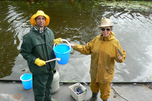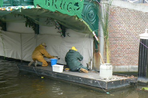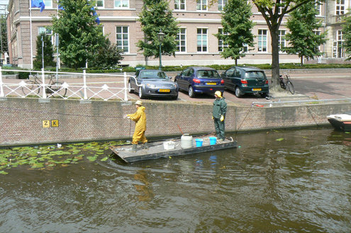Afgelopen middag ging het team Reuring, dat bestaat uit de Leidse kunstenaars Julia van Adrichem en Paul Bouter, aan de slag met hun kunstwerk onder de Nieuwsteegbrug (Doezastraat). Het tweetal zou in het kader van het project Schemerbruggen al op 14 juli een landschap schilderen met gier (koeienpoep) om zo een ‘luchtbrug’ te maken, maar dat ging door het noodweer niet door. Inmiddels is het karwei geklaard en kan nu mee in de vaartocht langs 10 kunstzinnige bruggen. Naast een luchtje wordt het kunstwerk ook opgeluisterd door vogelgeluiden. (Foto’s: Marjo Heemskerk)