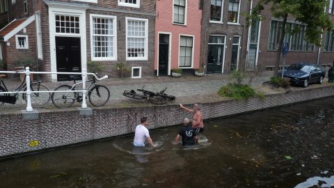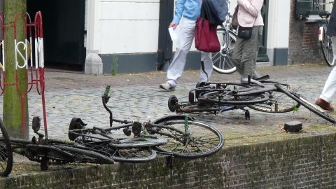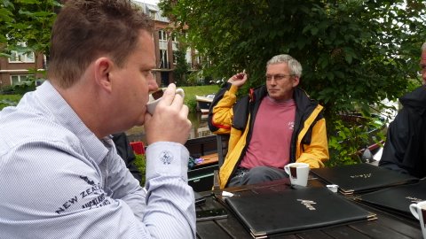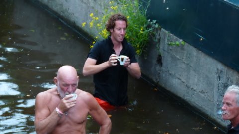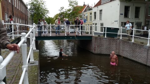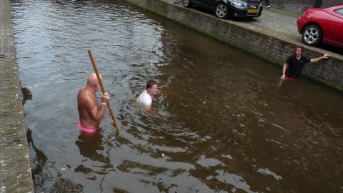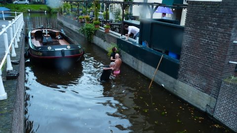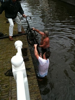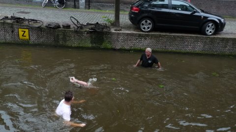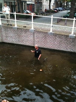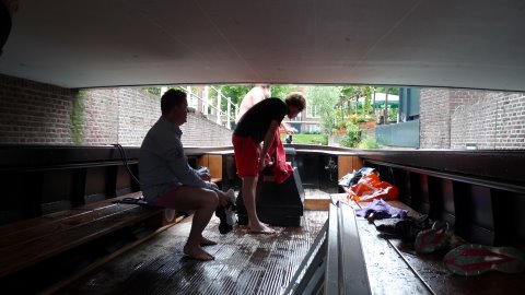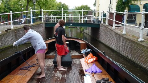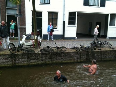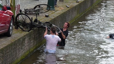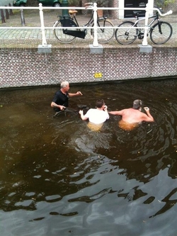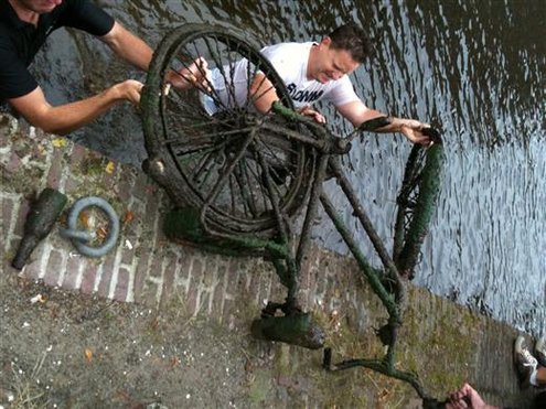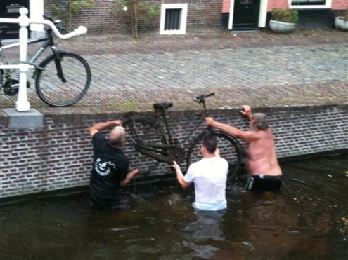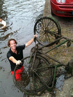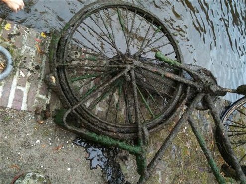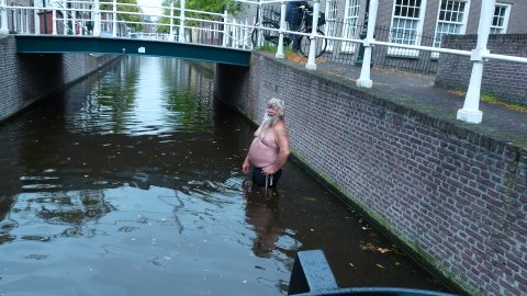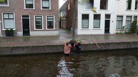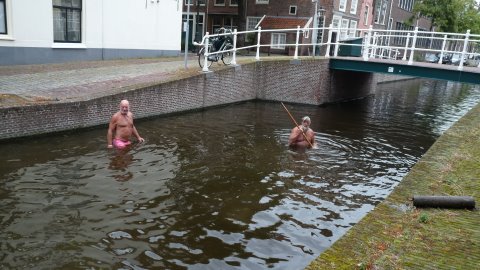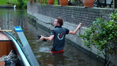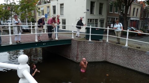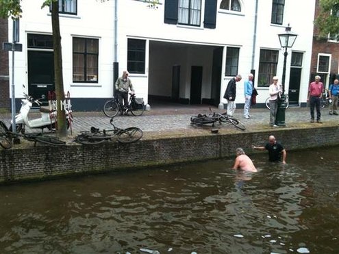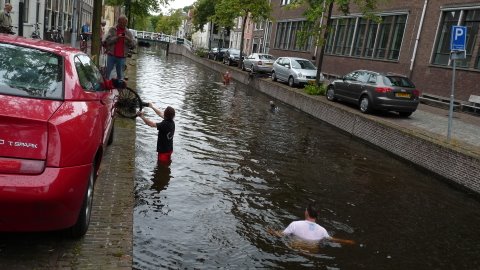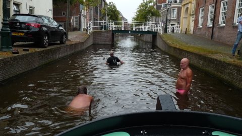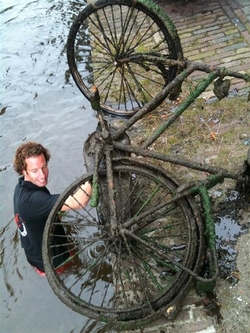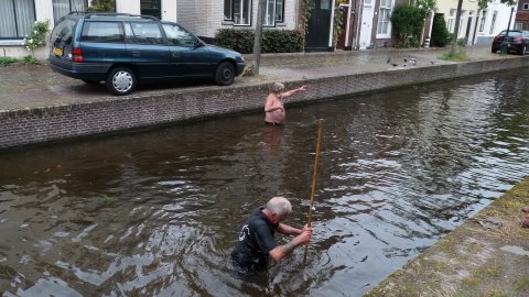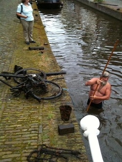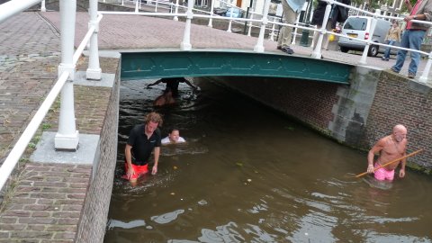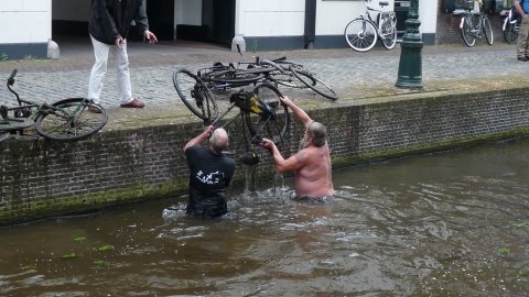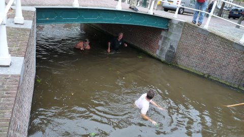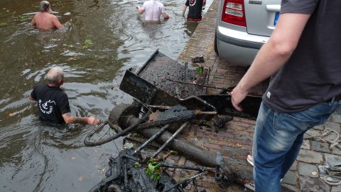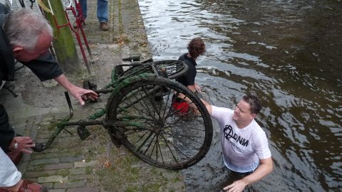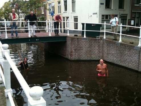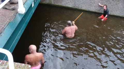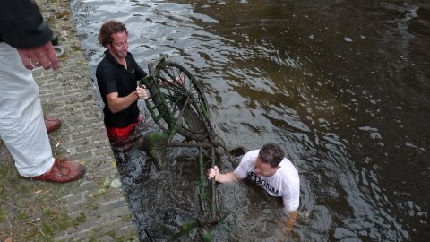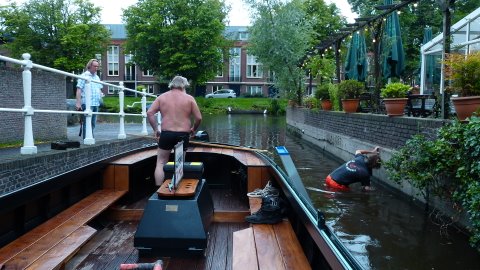 De mannen van de Leidse Rederij en de Drie Geuzen hebben gisteren de Groenhazengracht onder handen genomen, waarvan het ondiepe water langzaam, maar zeker totaal dichtslibde met rotzooi. Ondanks diverse schoonmaakacties in de Leidse wateren, was er aan deze verbinding tussen de Witte Singel en het Rapenburg nog niets gedaan en vonden de schippers het hoog tijd om zelf de handen uit de mouwen te steken. De ‘vangst’ bestond uit 19 fietsen, een aantal stalen binten, diverse verkeersborden, een reuze kaarsenstandaard en zelf een platenspeler. Daarnaast werden er bergen stenen uit het water gevist. Na afloop genoten de mannen van een kopje koffie op het terras van café de Grote Beer. ( Foto’s: Leidse Rederij en Ruud van As)