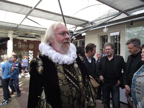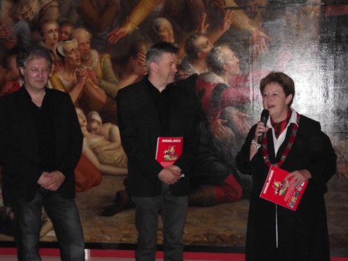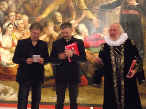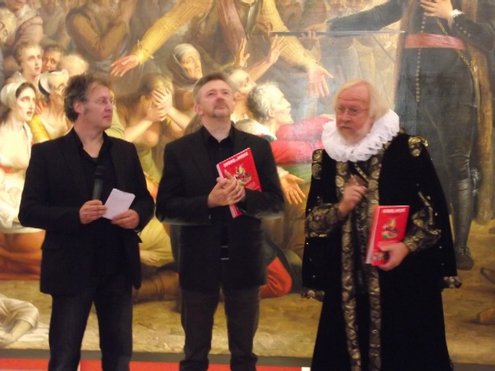 Burgemeester Van der Werf neemt het eerste exemplaar in ontvangst van de makers van het 'Het Lijdende Leiden': Peter van Gucht en Luc Morjaeu, foto en reportage: Jacqueline Borg. Video: IloveLeiden.com.
