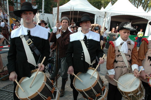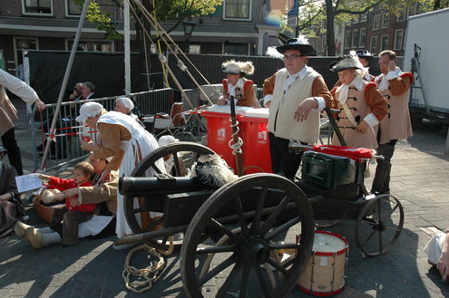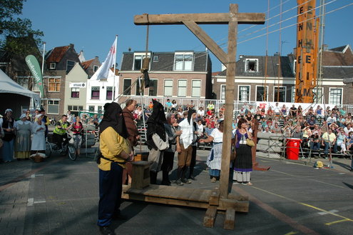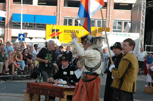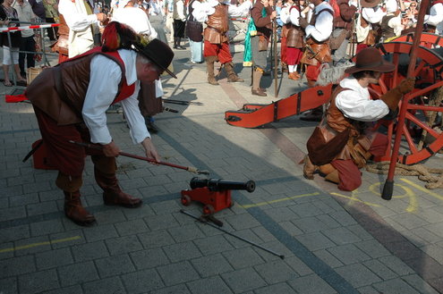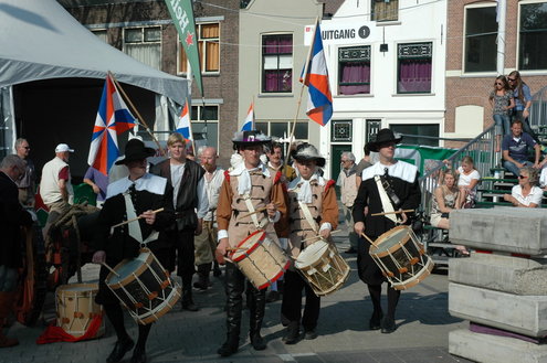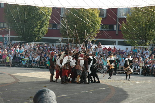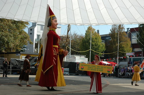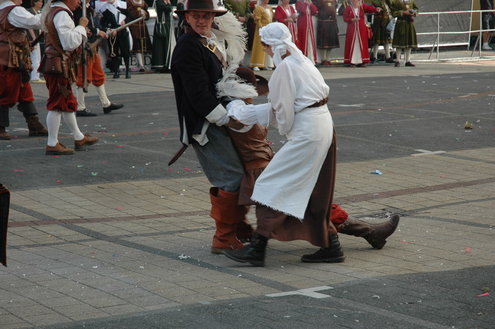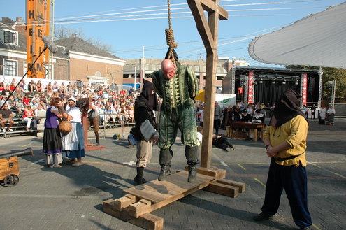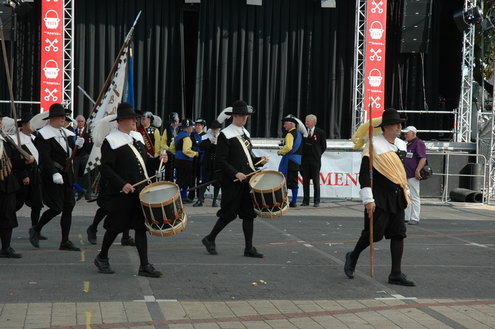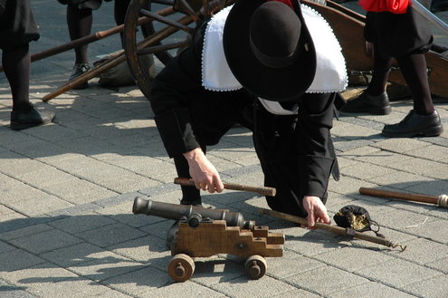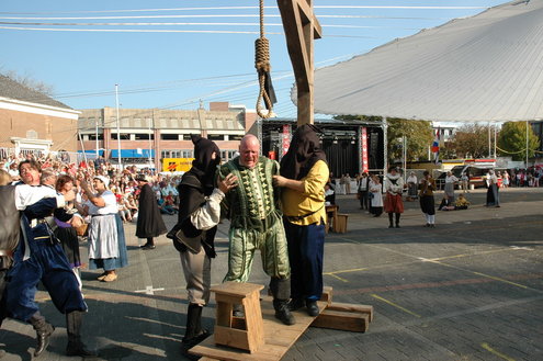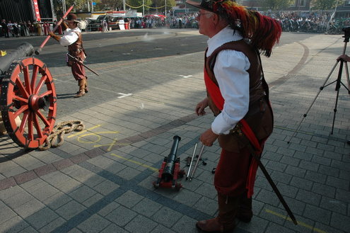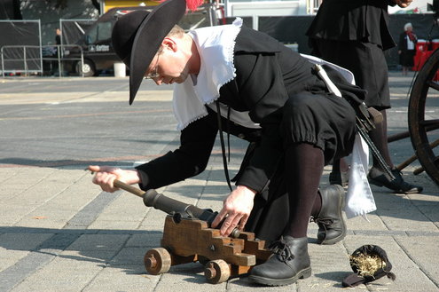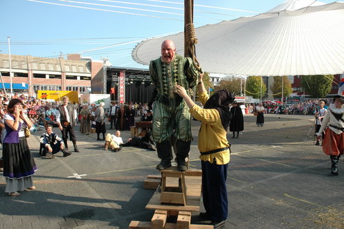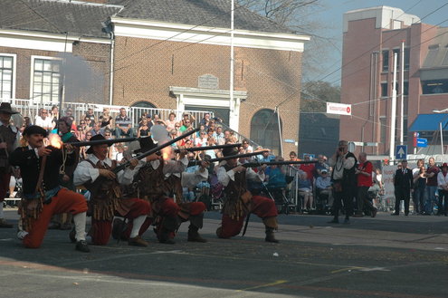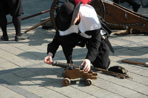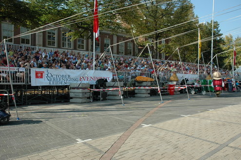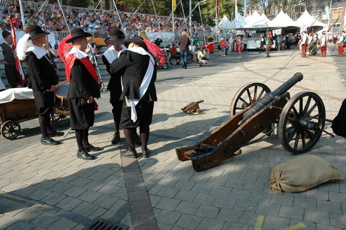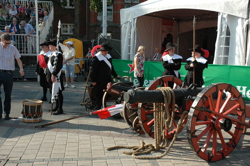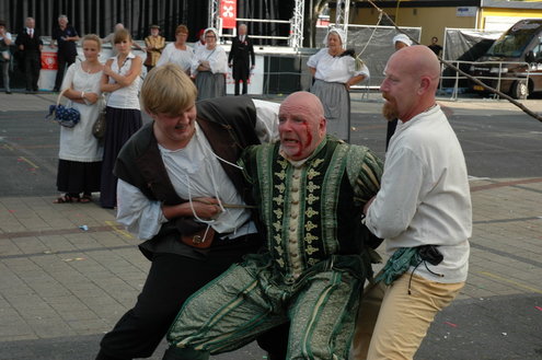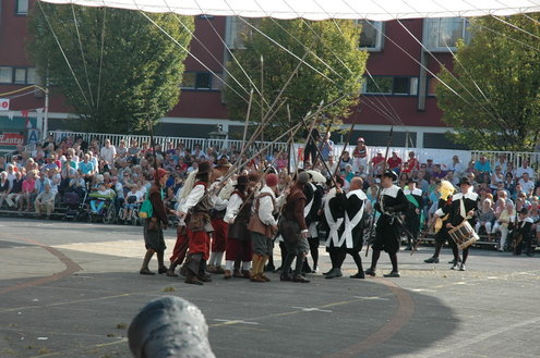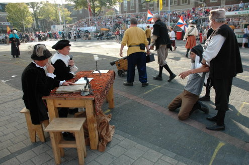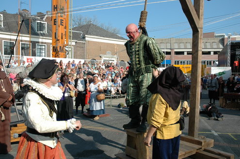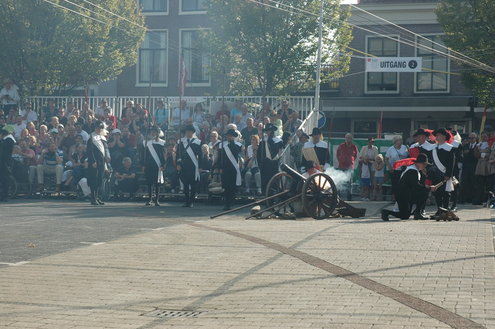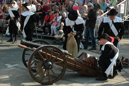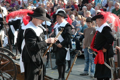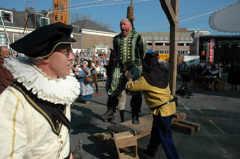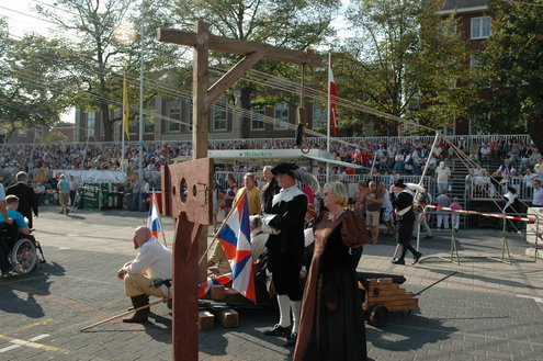 In Leiden vieren we 3 oktober bijzonder vredelievend vergeleken met de Briellenaren. Dat was vanmiddag goed te zien tijdens een presentatie van verschillende vestingsteden. Begon het programma nog rustig met muziek, vaandeliers en reuzen uit Bergen op Zoom, toen de Briellenaren het plein opkwamen was het gedaan met de rust. Een ware veldslag vond er plaats, inclusief kanonnen, zwaarden, een schandpaal en als klap op de vuurpijl het ophangen van de Spaanse veldheer Valdez.