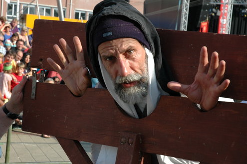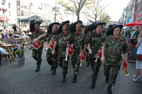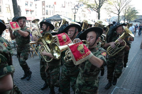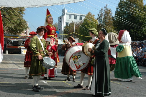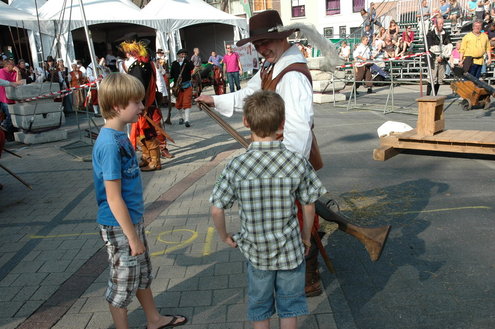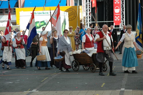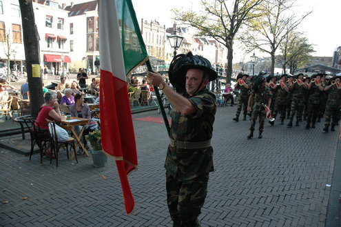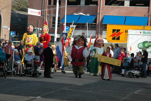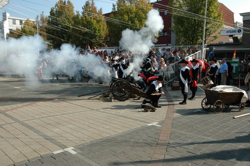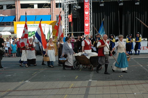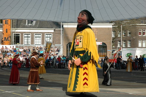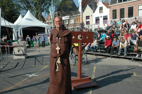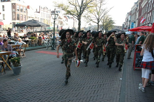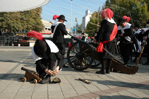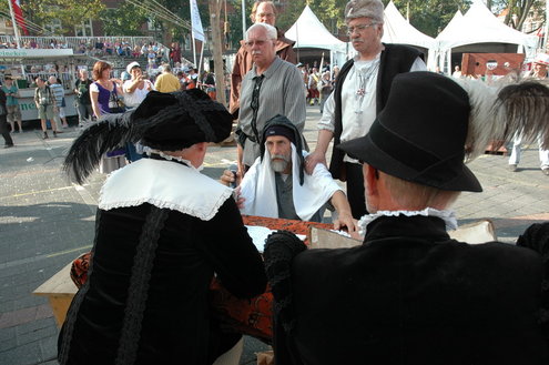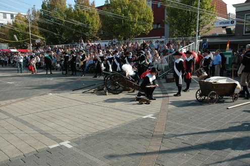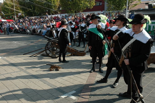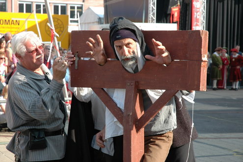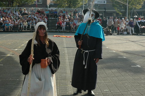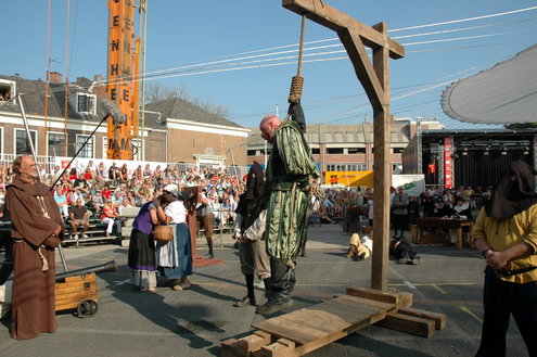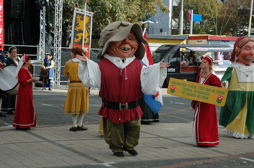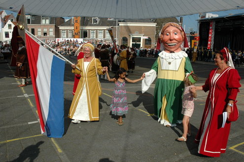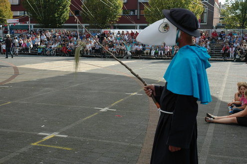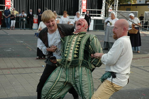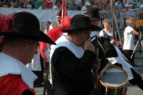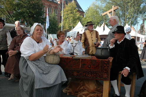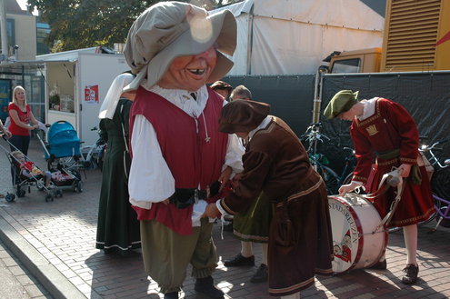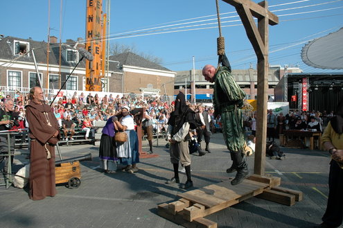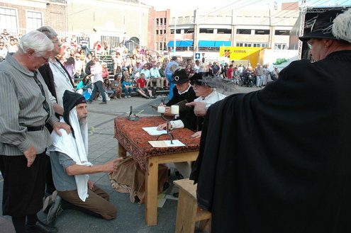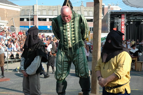 In Leiden vieren we 3 oktober bijzonder vredelievend vergeleken met de Briellenaren. Dat was vanmiddag goed te zien tijdens een presentatie van verschillende vestingsteden. Begon het programma nog rustig met muziek, vaandeliers en reuzen uit Bergen op Zoom, toen de Briellenaren het plein opkwamen was het gedaan met de rust. Een ware veldslag vond er plaats, inclusief kanonnen, zwaarden, een schandpaal en als klap op de vuurpijl het ophangen van de Spaanse veldheer Valdez.
