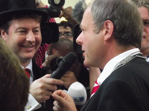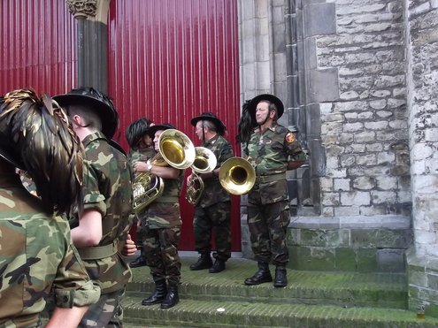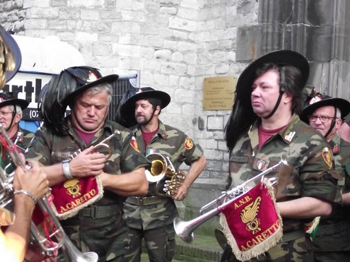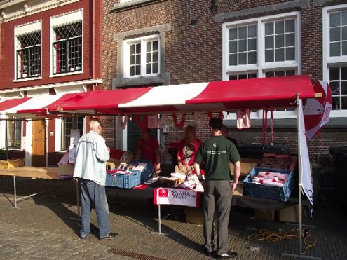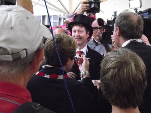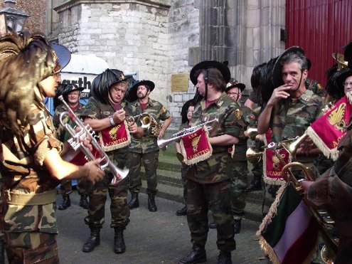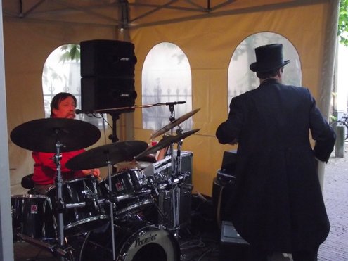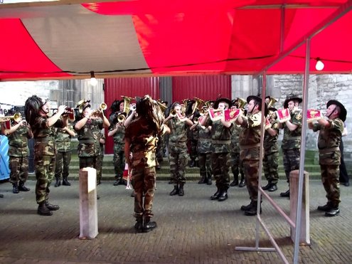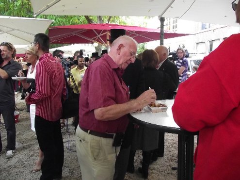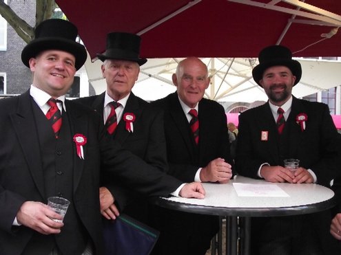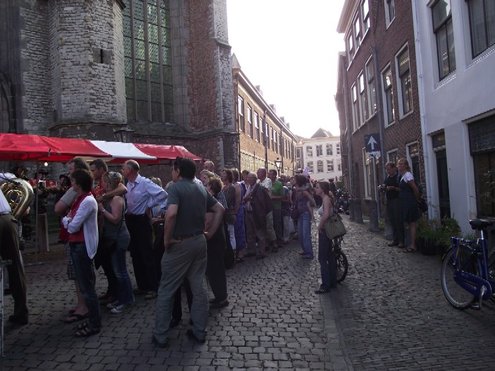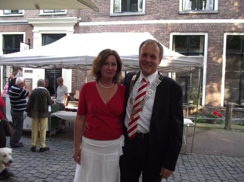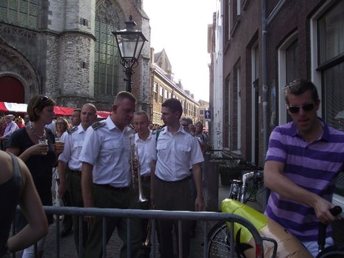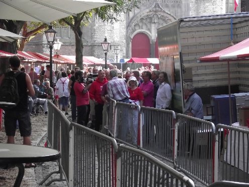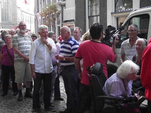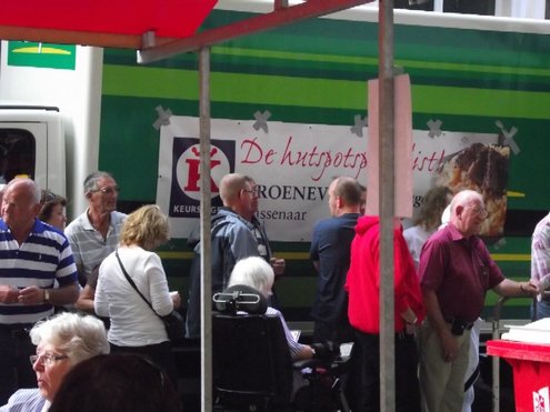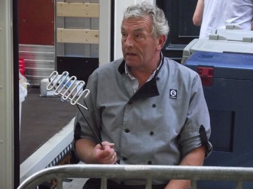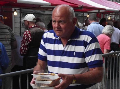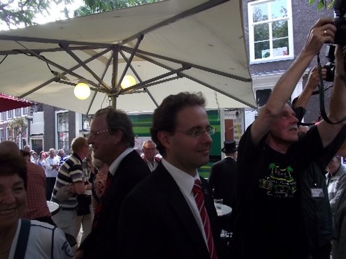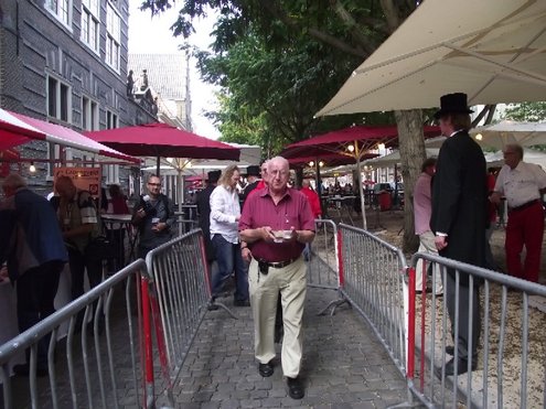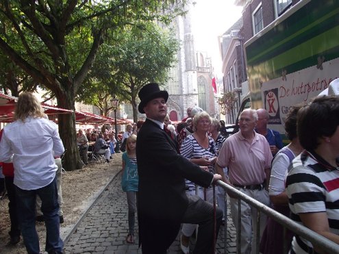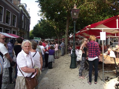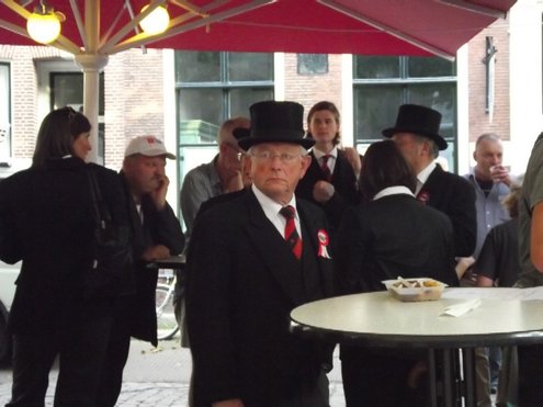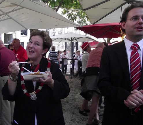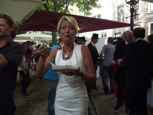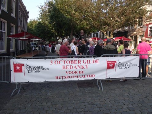 Het leek nog warmer dan zo’n vijf jaar geleden, toen de Leidenaren ook al in korte broek aan de traditionele hutspotmaaltijd zaten op de Hooglandse Kerkgracht. Drommen mensen stonden in de rij in een zomers namiddagzonnetje, terwijl de geuren van de warme wintermaaltijd al opstegen. Het wachten was op burgemeester Lenferink, die samen met de voorzitter van de 3 October vereeniging, Els van Eijck van Heslinga, de hutspot voorproefde én goedkeurde. Lenferink: ”Ik zou maar meteen twee porties tegelijk bestellen, heerlijk!” Daarna schoven de rijen gestaag en feestelijk muzikaal begeleid, langs de kramen voor hun porties en namen plaats aan de tafels, waar meestal de partners of andere familieleden al zaten te wachten. (Foto en reportage: Jacqueline Borg)