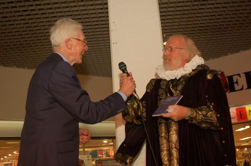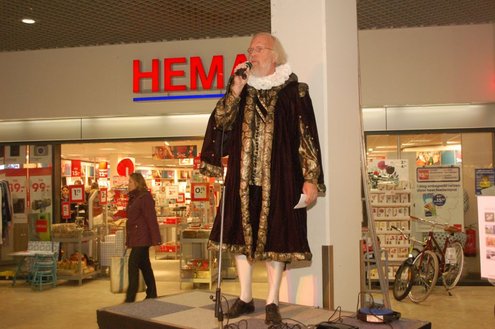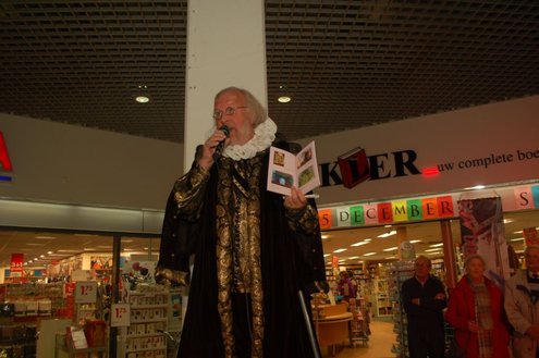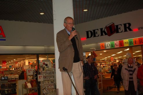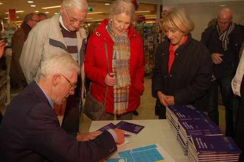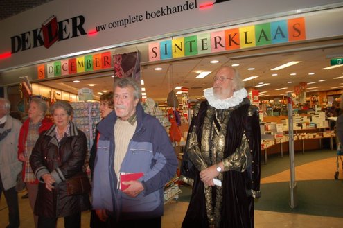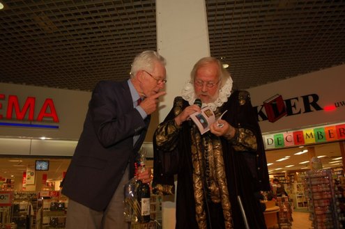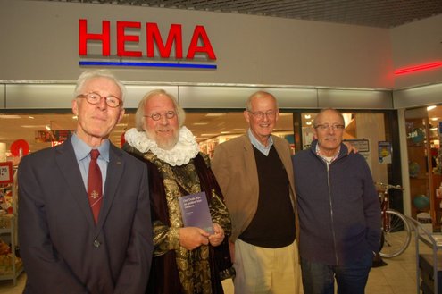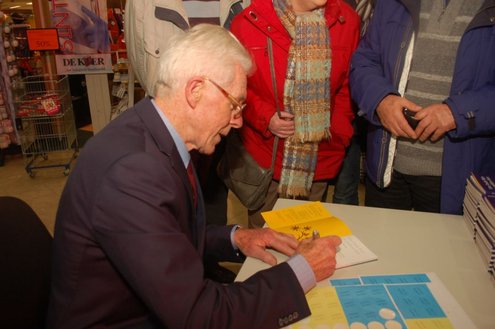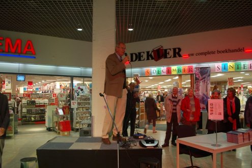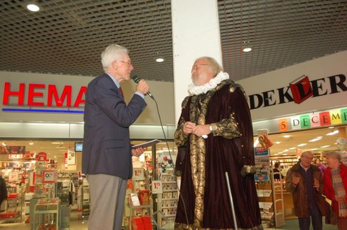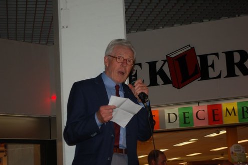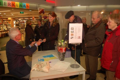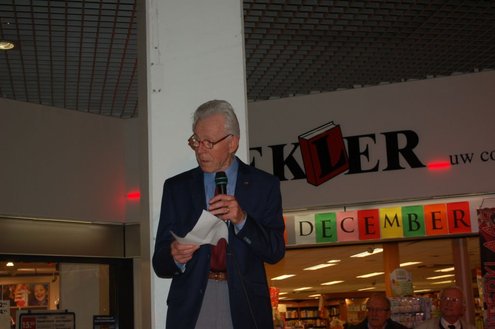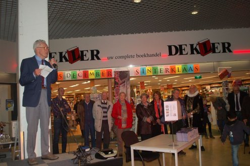Gisteravond vond de feestelijke presentatie plaats van de nieuwe dichtbundel van Jan van der Kooij, bij boekhandel De Kler in Leiderdorp. Het boekwerkje onder de titel: “Om oude rijn en polders hier rondom“ is uitgegeven door De Gyselaar, vertegenwoordigd door Har Meijer. Het eerste exemplaar werd overhandigd aan Eric Filemon in zijn rol als burgemeester Van der Werf. Na afloop van de feestelijkheden signeerde De Kooij zijn dichtbundel. (Foto’s: Emile van Aelst)