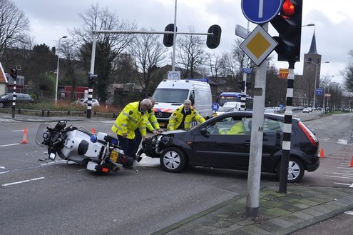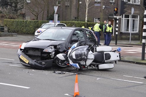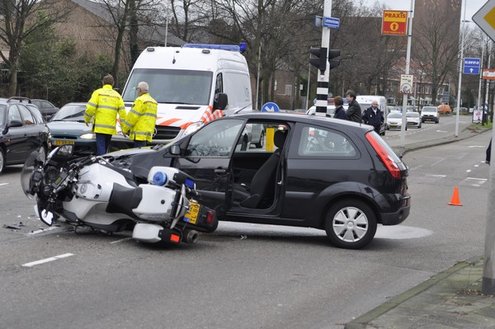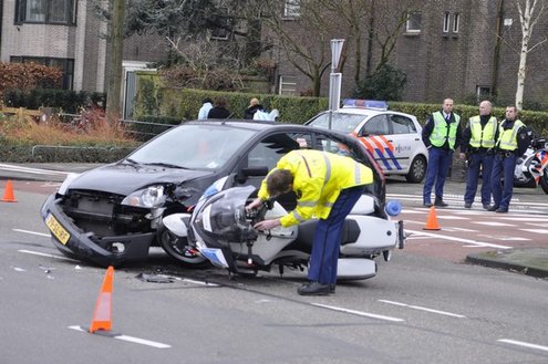 Bij een aanrijding tussen een personenauto en een motoragent van de Politie Hollands-Midden raakten beide voertuigen vanmorgen rond half tien behoorlijk beschadigd. De motoragent was onderweg naar een melding van een overval in Zoetermeer toen de aanrijding plaatsvond op de kruising met de Zoeterwoudsesingel. Het letsel van de agent lijkt mee te vallen, zo laat een van zijn collega’s via twittter weten. (Foto: Chris de Waard, repo: (Foto: C. v/d Star / District16.nl).