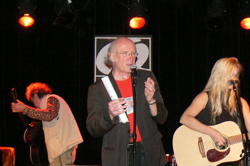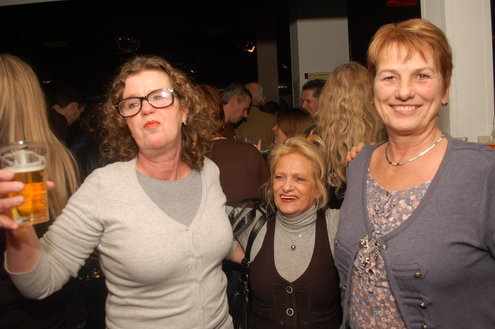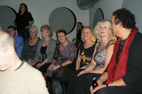 Presentator Fons Delemarre met Sjors en Flo op het podium tijdens de tributeavond in de Qbus (Foto's: Emile van Aelst en Marjo Heemskerk).