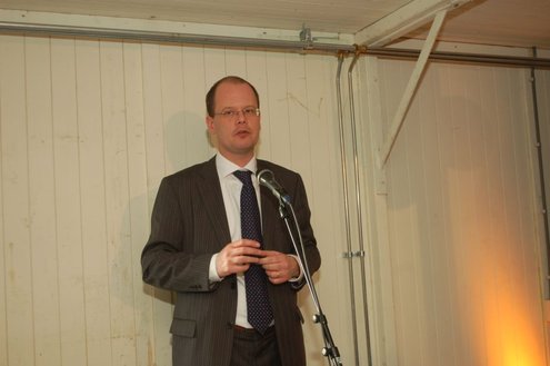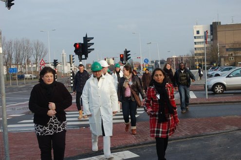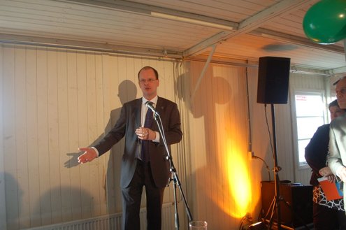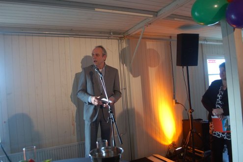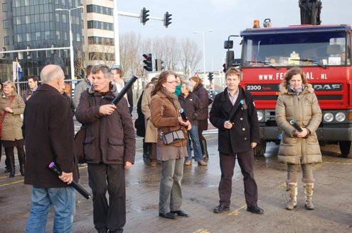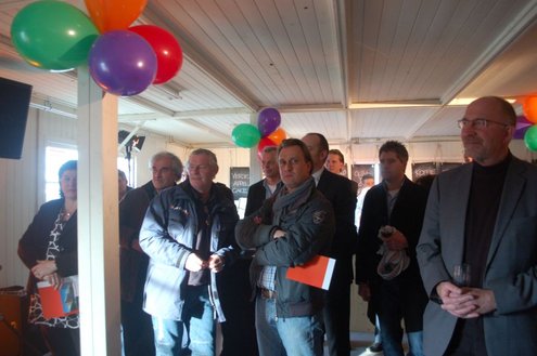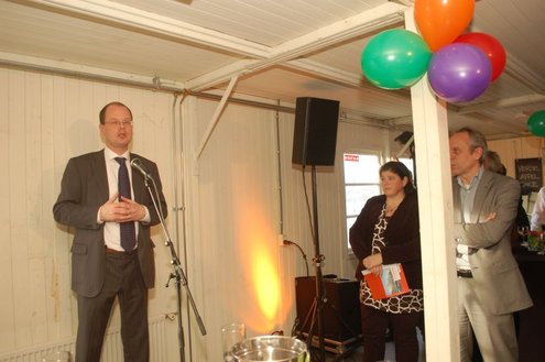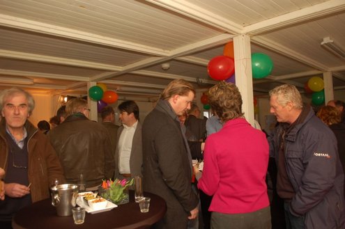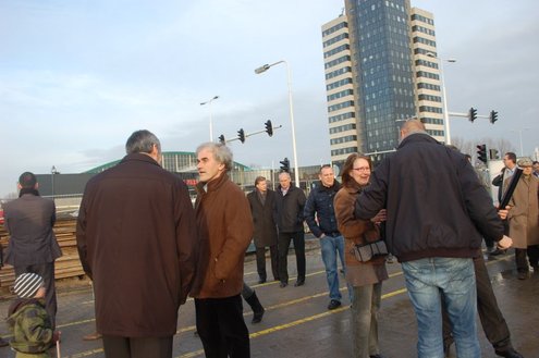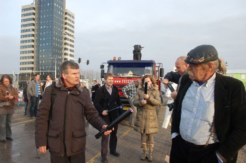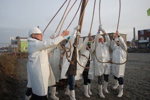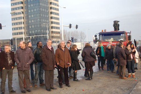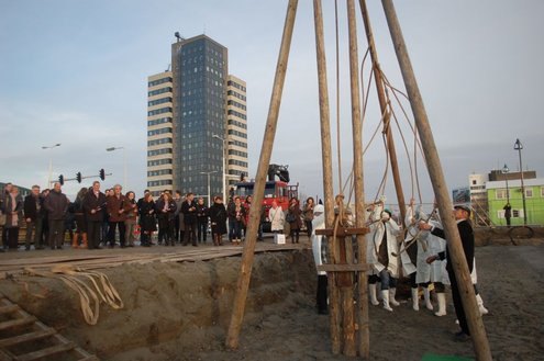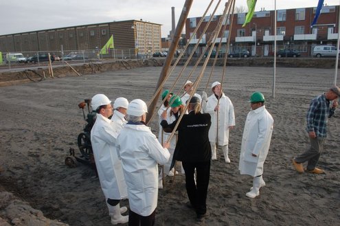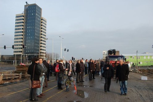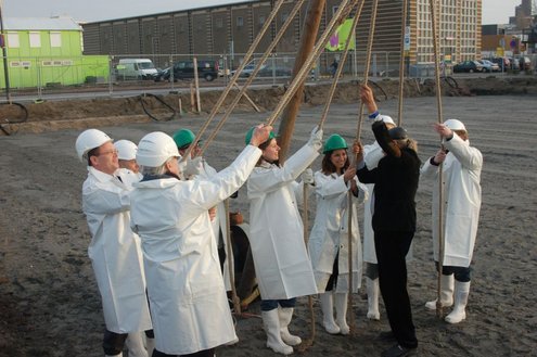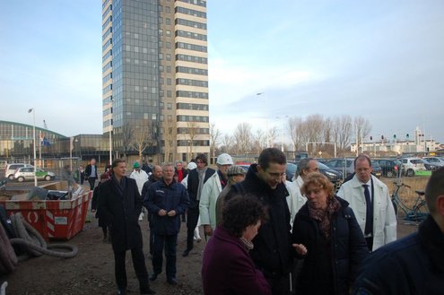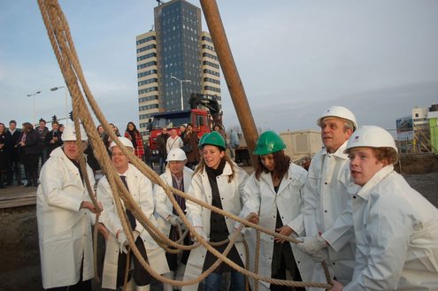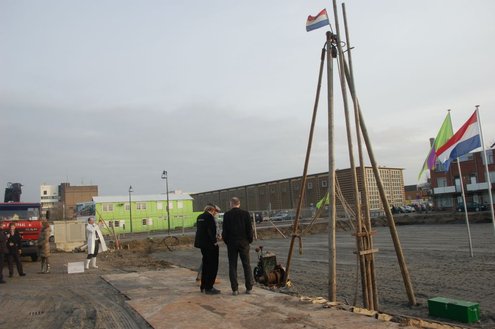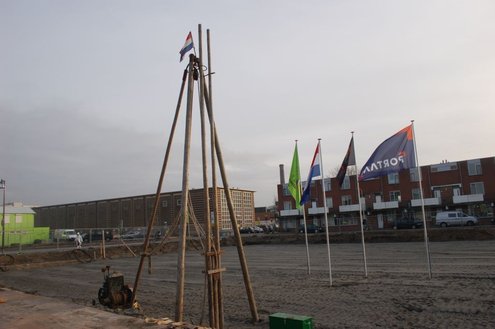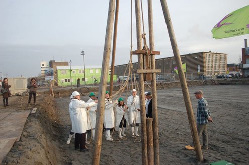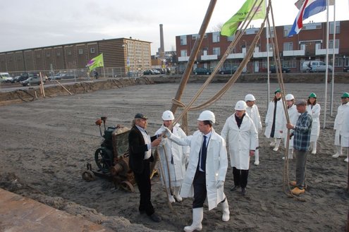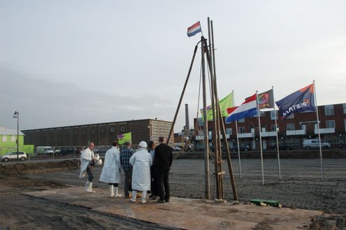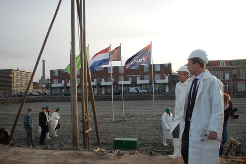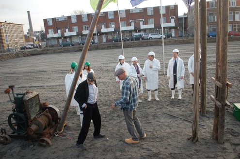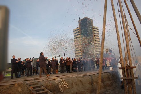 Afgelopen donderdag sloeg wethouder Pieter van Woensel symbolisch de eerste paal voor de bouw van Skyline I en II. Samen met enkele toekomstige bewoners werd hiermee de grondslag gelegd voor dit slotstuk van het project Nieuw Leyden. Beide Skylines komen aan de rand van Nieuw Leyden te staan, tegen de Willem de Zwijgerlaan en vormen een onderdeel van de gebiedsontwikkeling in Mooi Noord. Over twee jaar worden in totaal 53 koopwoningen, waarvan acht eengezinswoningen, 47 sociale huurwoningen en één zorgwoning opgeleverd. Na afloop van het officiële startsein werd het glas geheven. Skyline is ontworpen door ‘Heren 5 architecten’ en wordt gebouwd door Era Contour. Meer info: www.skylineleiden.nl en www.mooinoord.nl (Foto’s: Emile van Aelst.)