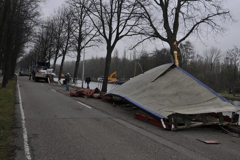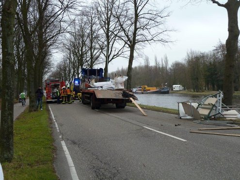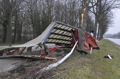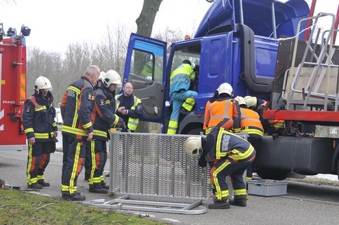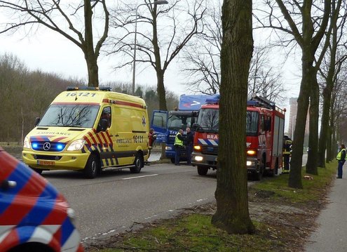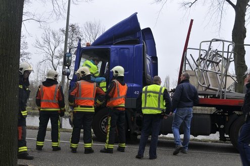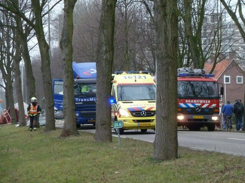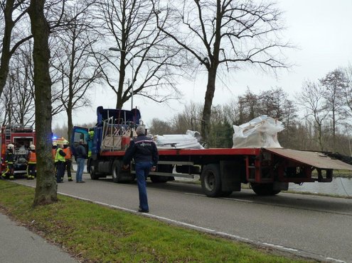 De chauffeur van een vrachtwagen met oplegger raakte rond 15.30 uur op de Kanaalweg een lantaarnpaal en vervolgens een boom. Daarbij raakte de vrachtwagen zwaar beschadigd. De trailer werd compleet uit elkaar gescheurd. De chauffeur is door de brandweer uit de cabine gehaald en naar het ziekenhuis overgebracht. Over de aard van zijn verwondingen is nog niets bekend. De Kanaalweg was enige tijd afgesloten voor het verkeer. (Foto's: Chris Verplancke (eerste vier) en C. van der star / District16.nl).