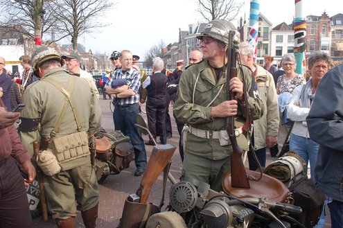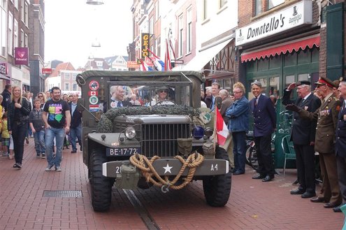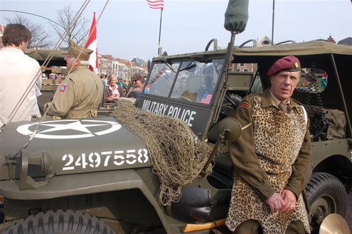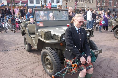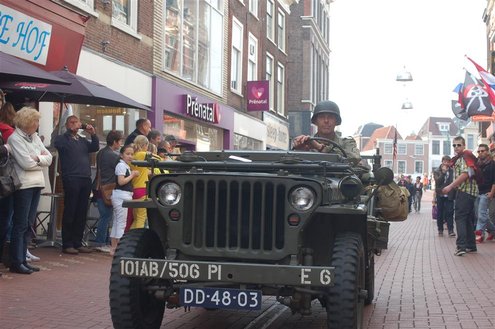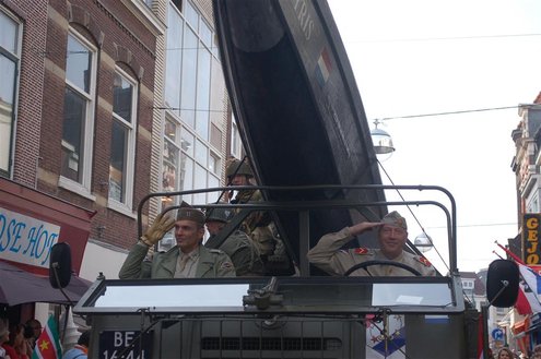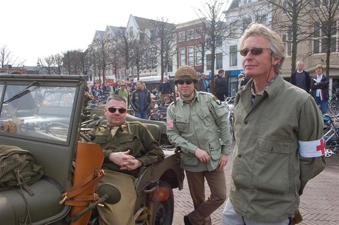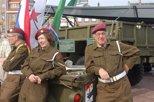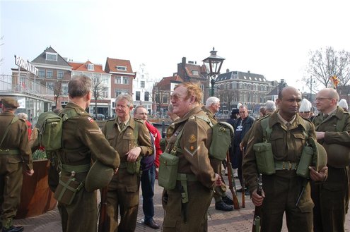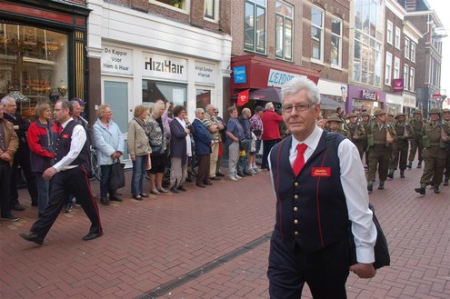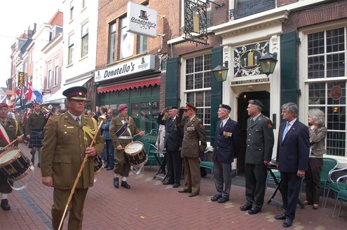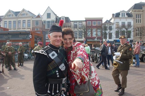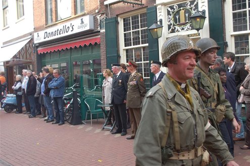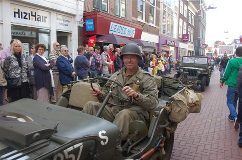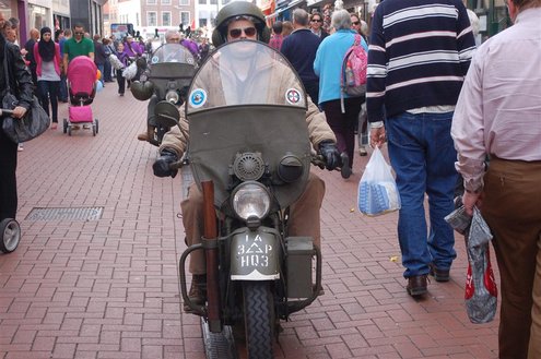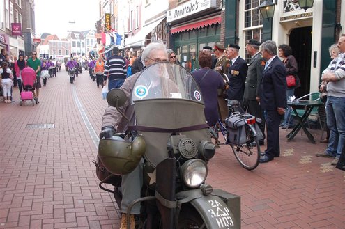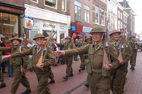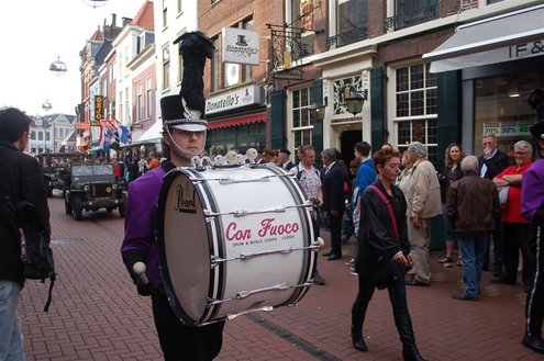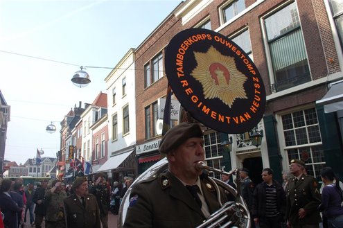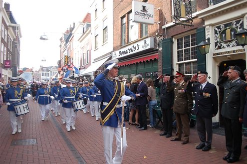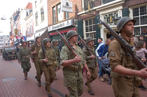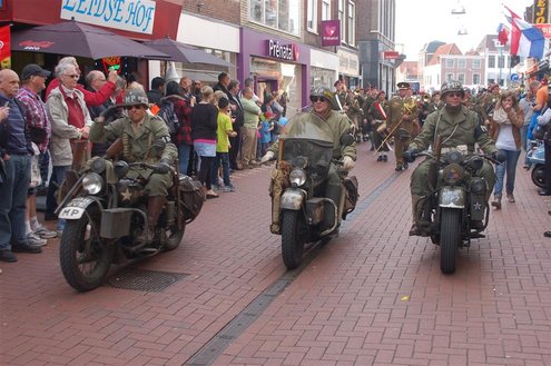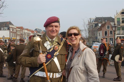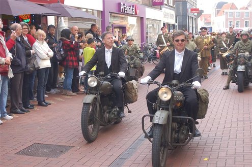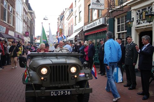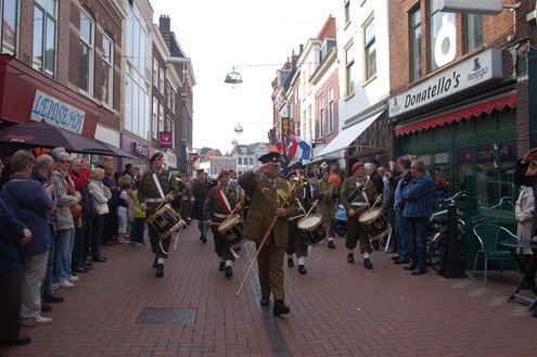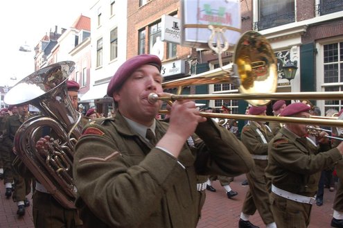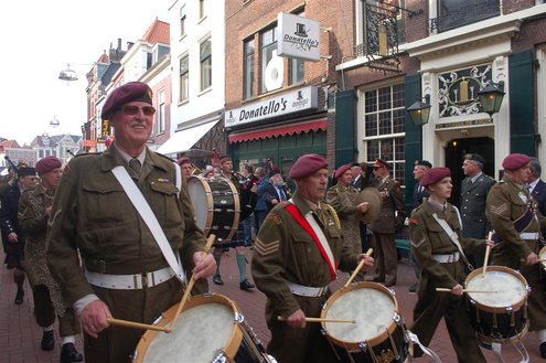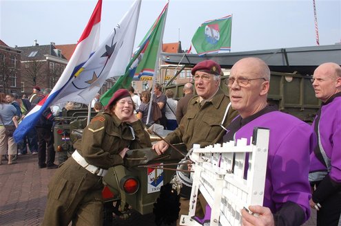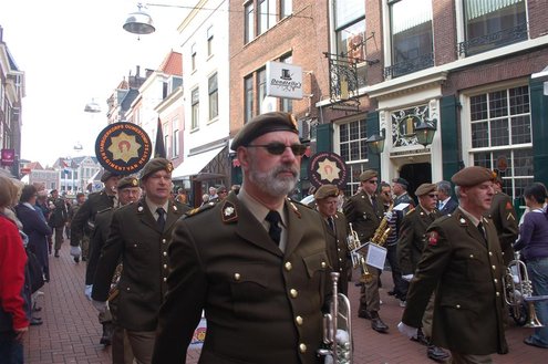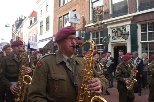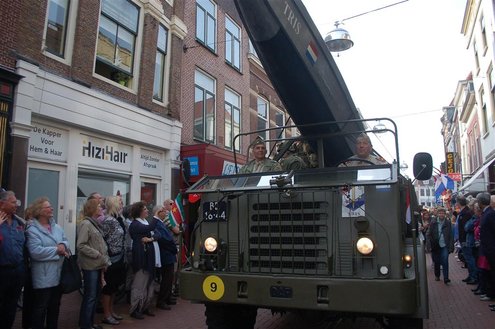 De Band of Liberation paradeerde in het kader van de ‘Military History Day 2012’ gistermiddag door een zonovergoten Leidse binnenstad. De stoet met diverse bands, motoren en oude legervoertuigen bracht een ode aan “onze bevrijders” van de Tweede Wereldoorlog. Op het plein bij de Hooglandse Kerk vond een grote ‘militariabeurs’ plaats en de dag werd in de kerk afgesloten met een indrukwekkend concert met medewerking van Big Band Hans Dubbelaar en de Band of Liberation en zang van Rebecca Robinson. (Foto’s: Emile van Aelst.)