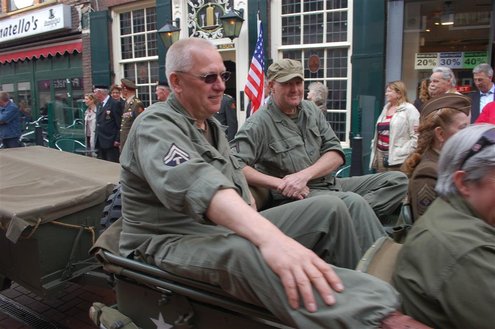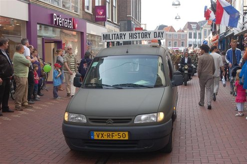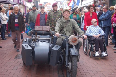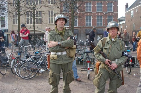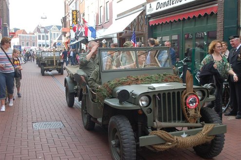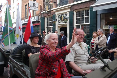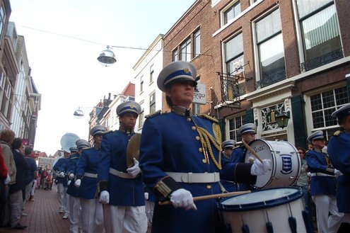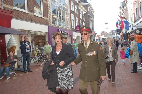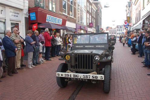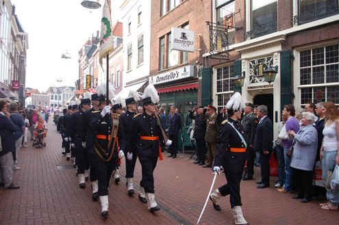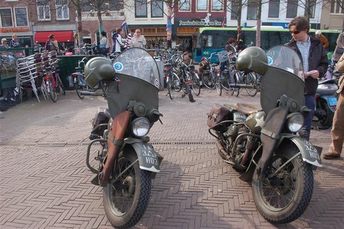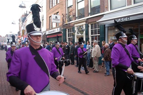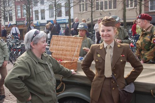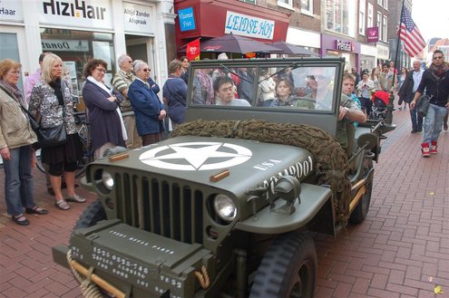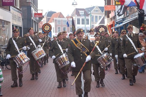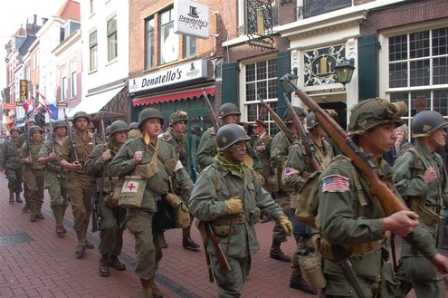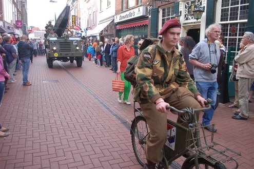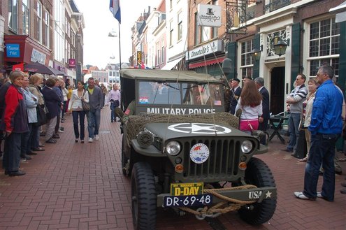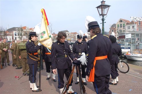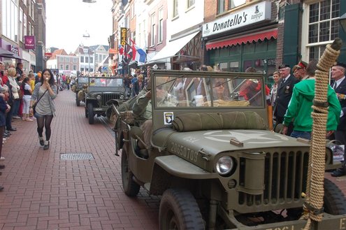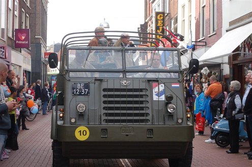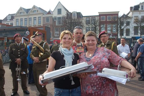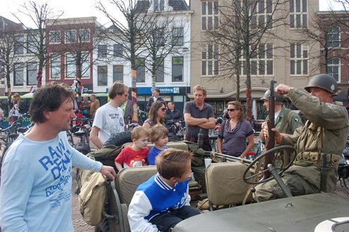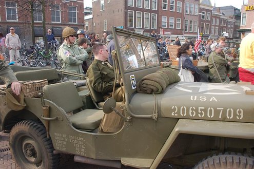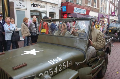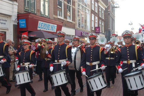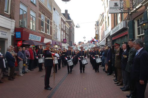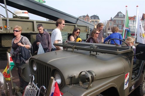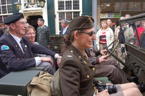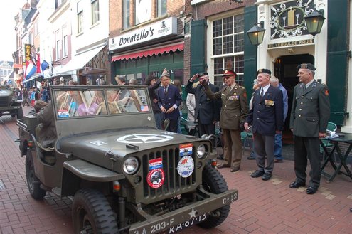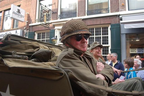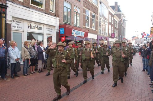 De Band of Liberation paradeerde in het kader van de ‘Military History Day 2012’ gistermiddag door een zonovergoten Leidse binnenstad. De stoet met diverse bands, motoren en oude legervoertuigen bracht een ode aan “onze bevrijders” van de Tweede Wereldoorlog. Op het plein bij de Hooglandse Kerk vond een grote ‘militariabeurs’ plaats en de dag werd in de kerk afgesloten met een indrukwekkend concert met medewerking van Big Band Hans Dubbelaar en de Band of Liberation en zang van Rebecca Robinson. (Foto’s: Emile van Aelst.)