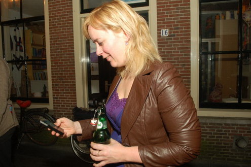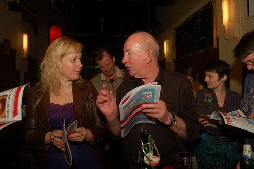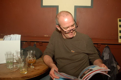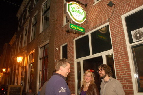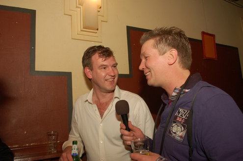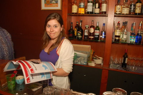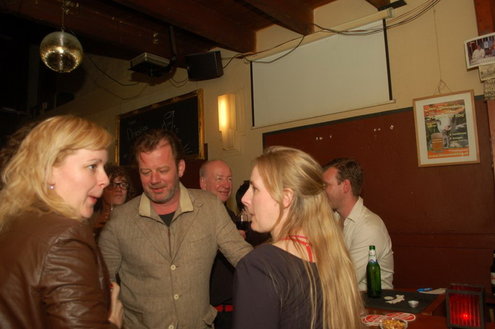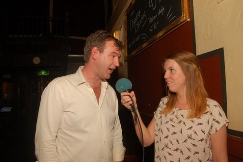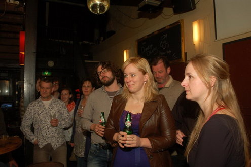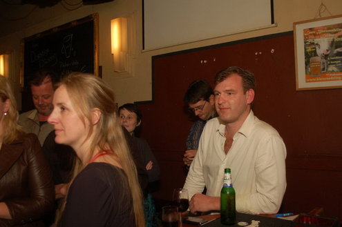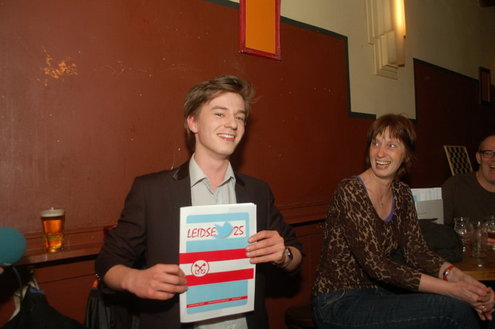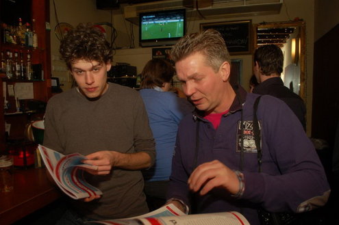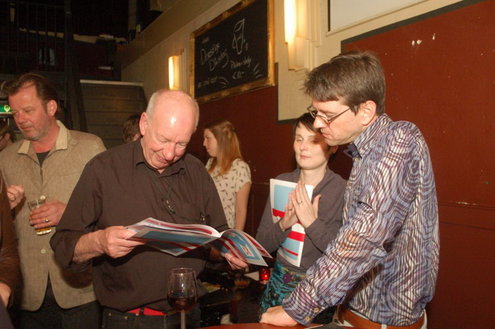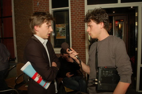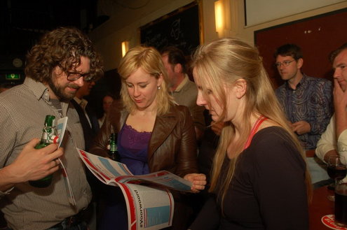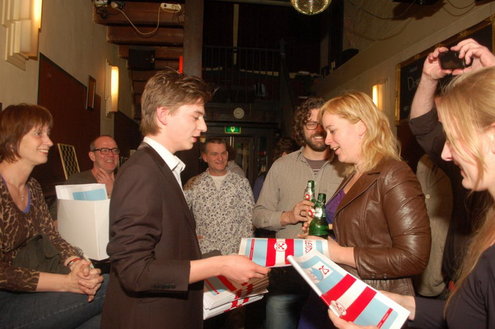 Cedric van der Ploeg deelt de magazines uit aan de aanwezige twitteraars. Afgelopen vrijdagavond presenteerde hij het blad en de site in Café Storm. (Foto's: Emile van Aelst).