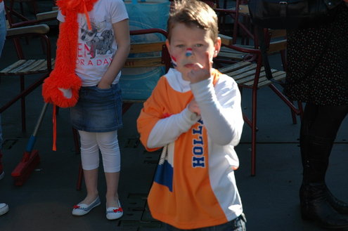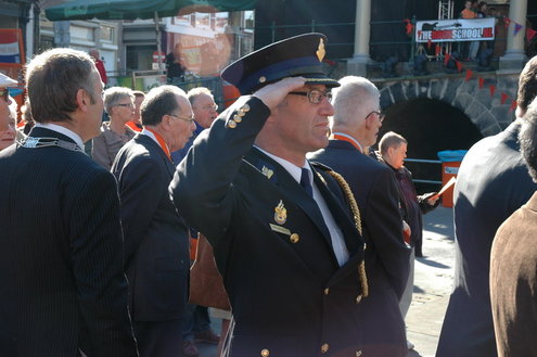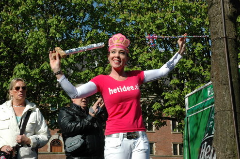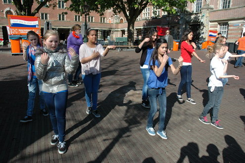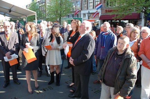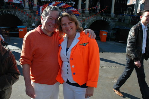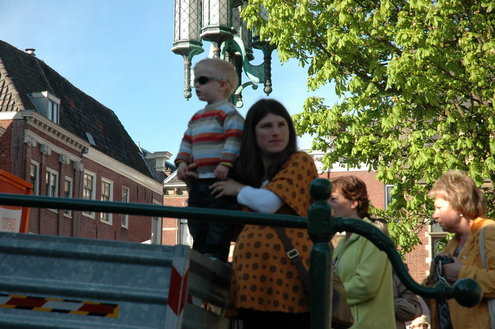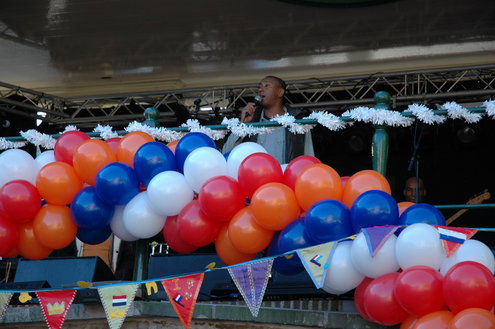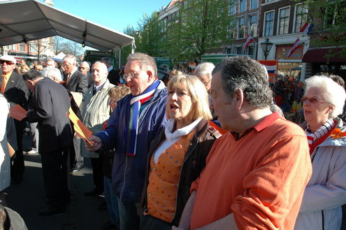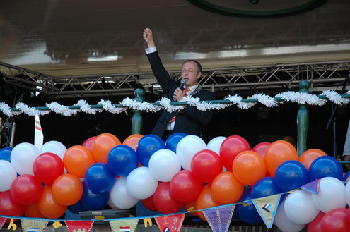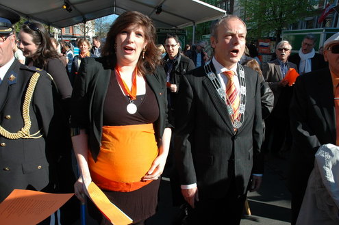 Barbara Zippro - Pouw is de nieuwe voorzitter van de Vereniging Koninginnedag Leiden. Samen met burgemeester Lenferink zong ze vanmorgen uit volle borst (en buik) het Wilhelmus. Het bezoeken van de wijken liet ze noodgedwongen aan haar voorganger Bert van der Velden over. Zippro is namelijk hoogzwanger en loopt bovendien met een been in het gips. (Foto's: Chris de Waard).