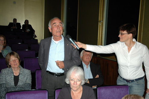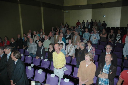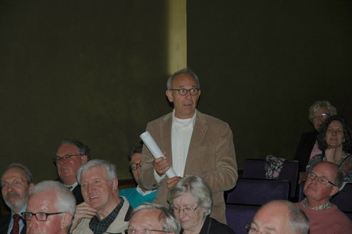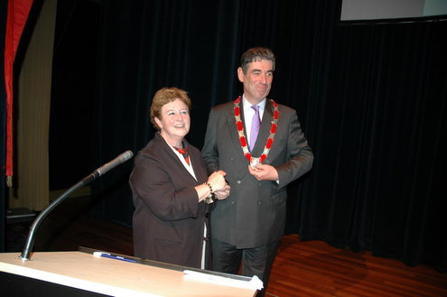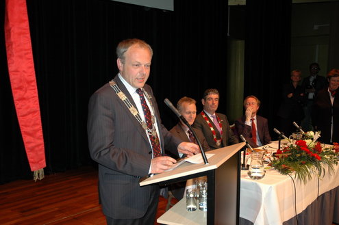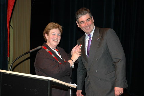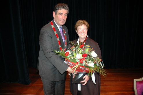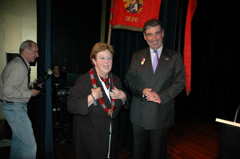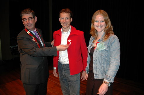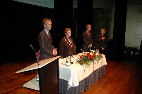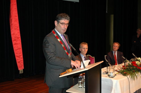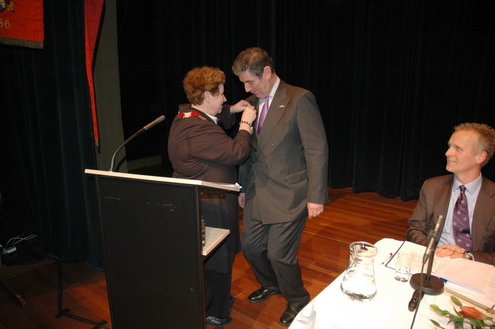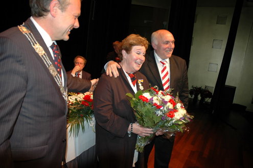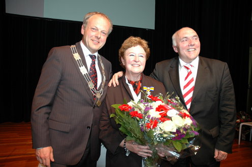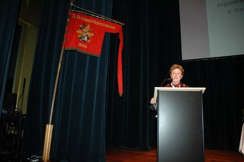 Tijdens de ledenvergadering nam Els van Eijck van Heslinga na zes jaar afscheid als voorzitter van de 3 October Vereeniging. Daarbij werd ze verrast met een koninklijke onderscheiding. Burgemeester Lenferink Lenferink speldde haar de versierselen op die horen bij de titel Ridder in de Orde van Oranje Nassau. De nieuwe voorzitter, Michiel Zonnevylle, werd bij acclamatie benoemd. (Foto's: Chris de Waard).