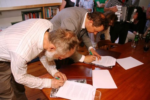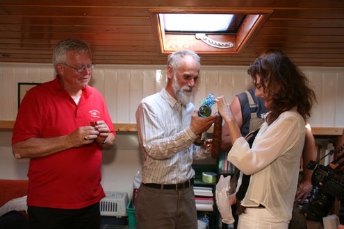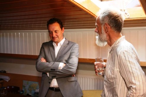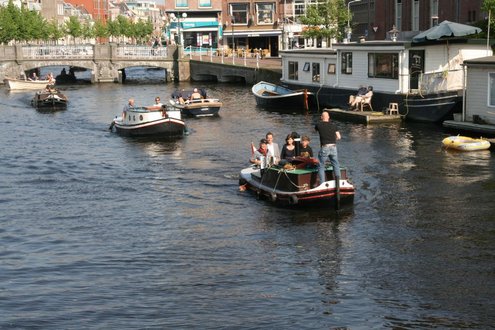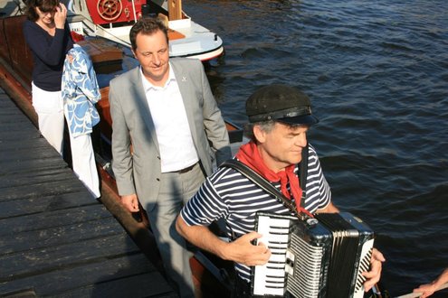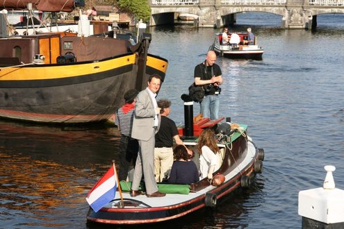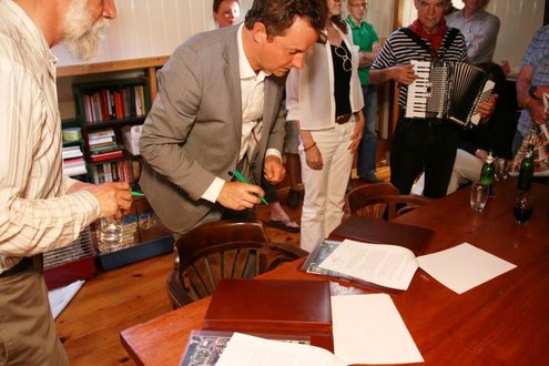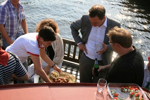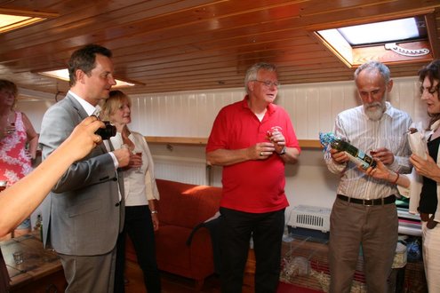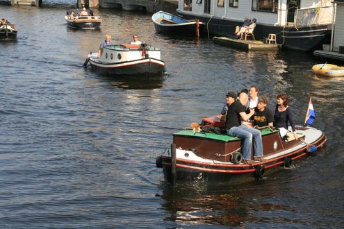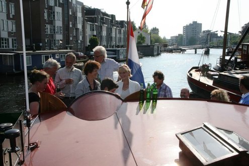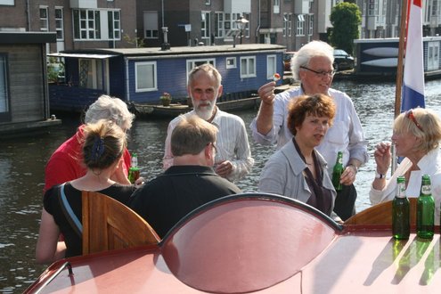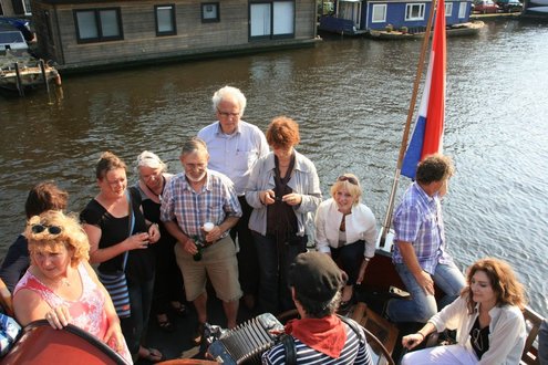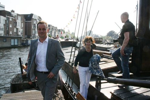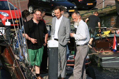 Afgelopen donderdag voer wethouder Frank de Wit (Onderwijs, Sport en Milieu) per ‘opduwer’ van het Stadhuis naar de Historische Haven aan het Galgewater. Na een kort tochtje over de nieuwe Rijn en Apothekersdijk werd de wethouder op het schip ‘De Welvaart’ door schipper Pepijn Hijdra ontvangen. Om het geheel een bijzonder maritiem tintje te geven zong accordeonist Peer zeemansliederen, waarbij de genodigden uit volle borst meezongen. Ondertussen kwamen onder het genot van schippersbitter de verhalen over de historie van de schepen en haven snel op gang. Na de gezellige ontvangst en speeches gingen de afgevaardigden over tot het officiële gedeelte van het bezoek en ondertekenden Frank de Wit en voorzitter Jarich van Oosten (Stichting Historische Haven) het convenant. Vervolgens voeren ze in colonne richting de Meelfabriek, waar ook historische sleepboten liggen en naar Sleepboothaven aan de Oude Singel/Houtmarkt waar Alje van Diedenhoven, (voorzitter Stichting Sleepboothaven Leiden) aan boord van sleepboot ‘De Oliebron’ ook het convenant ondertekende. Na afloop werd de wethouder snel naar het stadhuis teruggebracht, om op tijd bij de raadsvergadering aanwezig te kunnen zijn. (Foto’s: Leo de Vogel)
