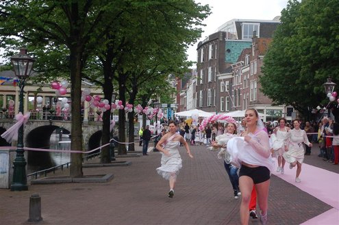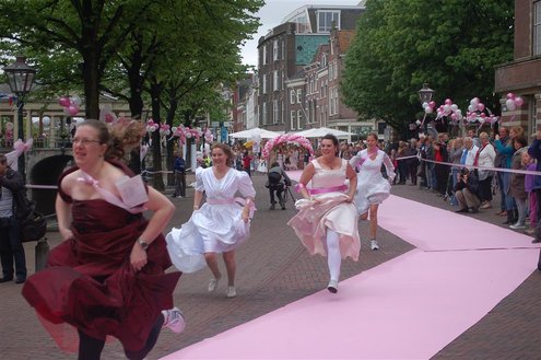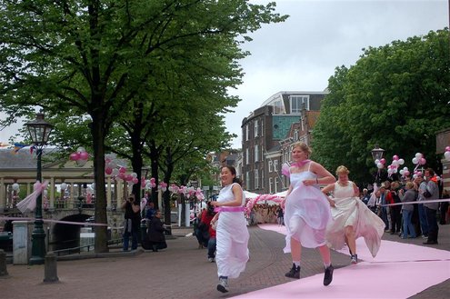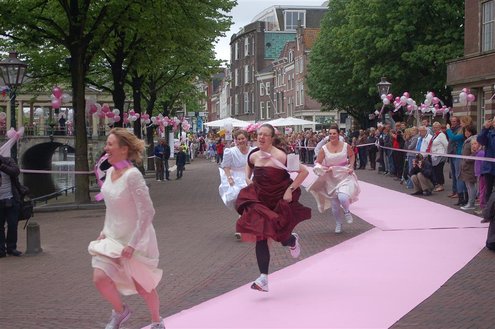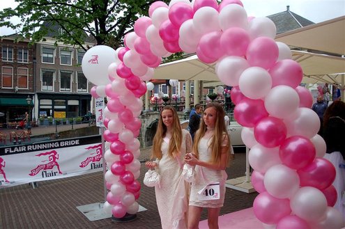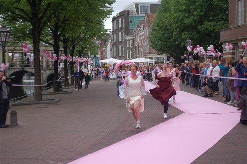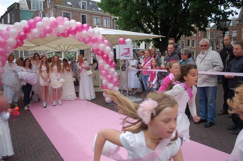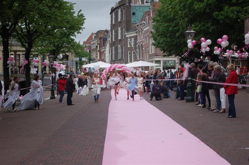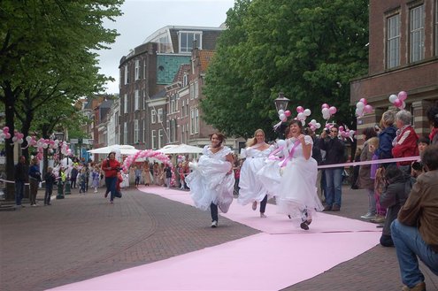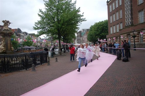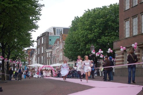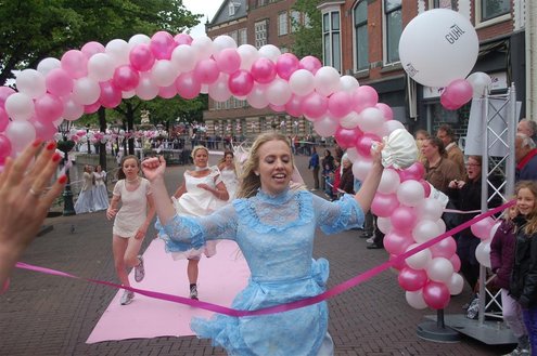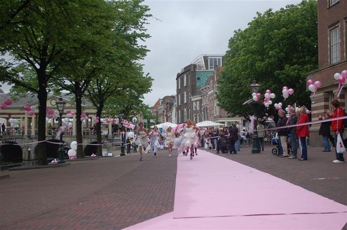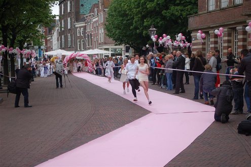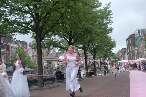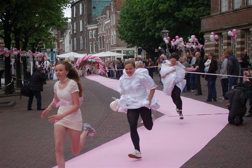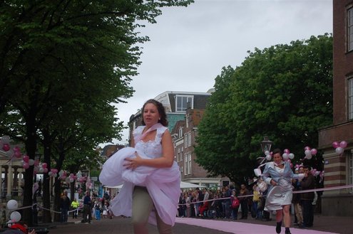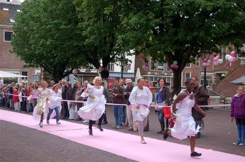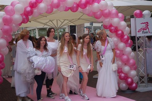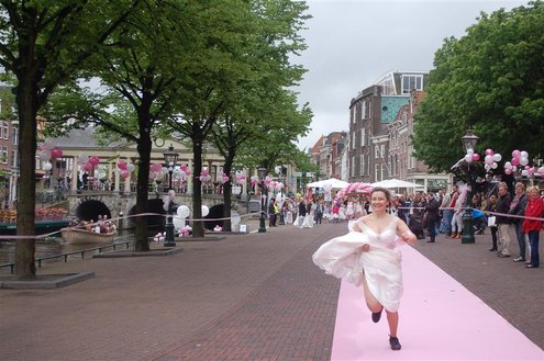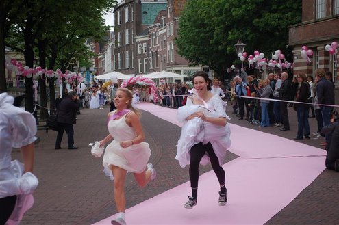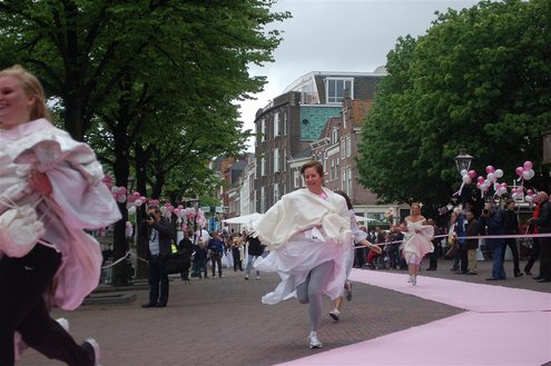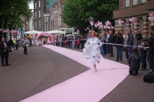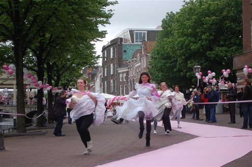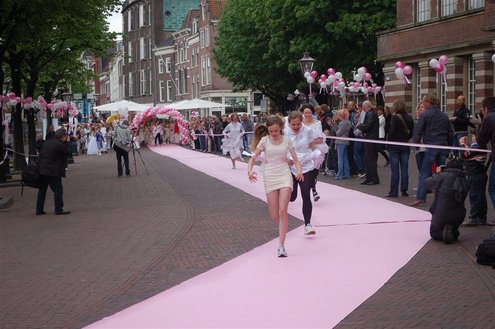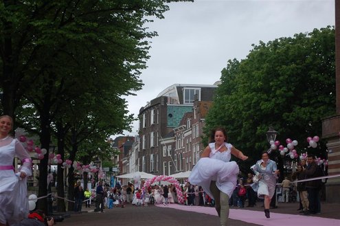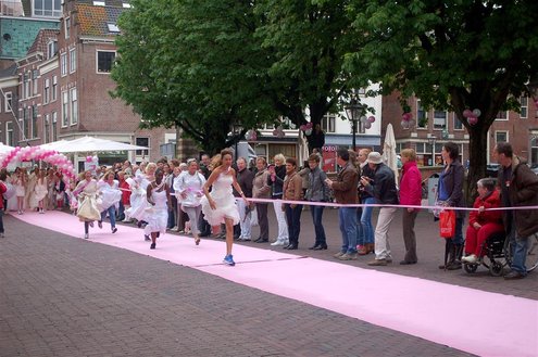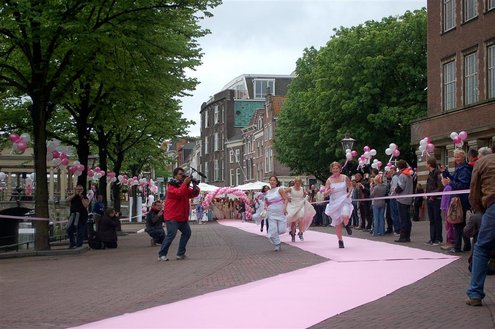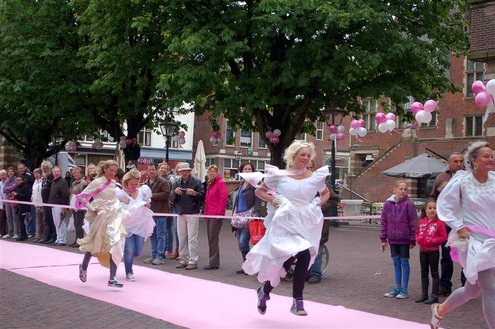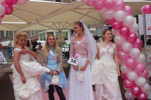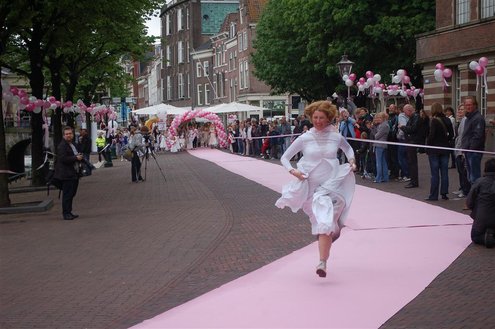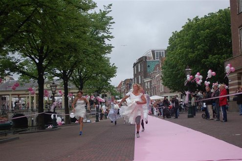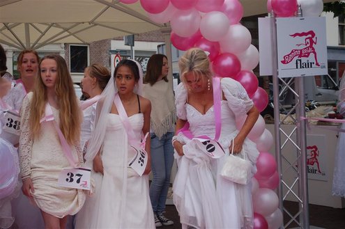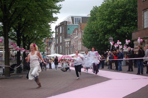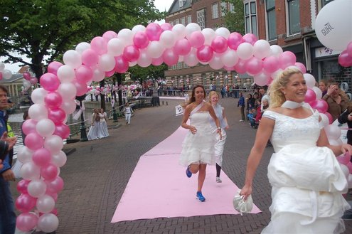 Vanmiddag vond voor de tweede maal de ‘Flair Running Bride’ plaats op het Stadhuisplein. Bruiden in hun mooiste jurken renden de benen uit het lijf om één van de aantrekkelijke prijzen in de wacht te slepen, zoals een volledig verzorgde huwelijksreis naar de zon, een Gucci-sieradenset en een trouwjurk naar keuze. Dit laatste lijkt wat vreemd, tenzij er gesprint werd in een geleend exemplaar. De meeste bruiden hadden de traditionele hoge hakken verruild voor een paar sportschoenen. De snelste bruid was Rianne Klein Brinke. Alle deelneemsters ontvingen een rijkelijk gevulde ‘goodiebag’ en na afloop stonden de champagne en natuurlijk een heuse bruidstaart klaar. Emile van Aelst was erbij en maakte een fotoverslag.